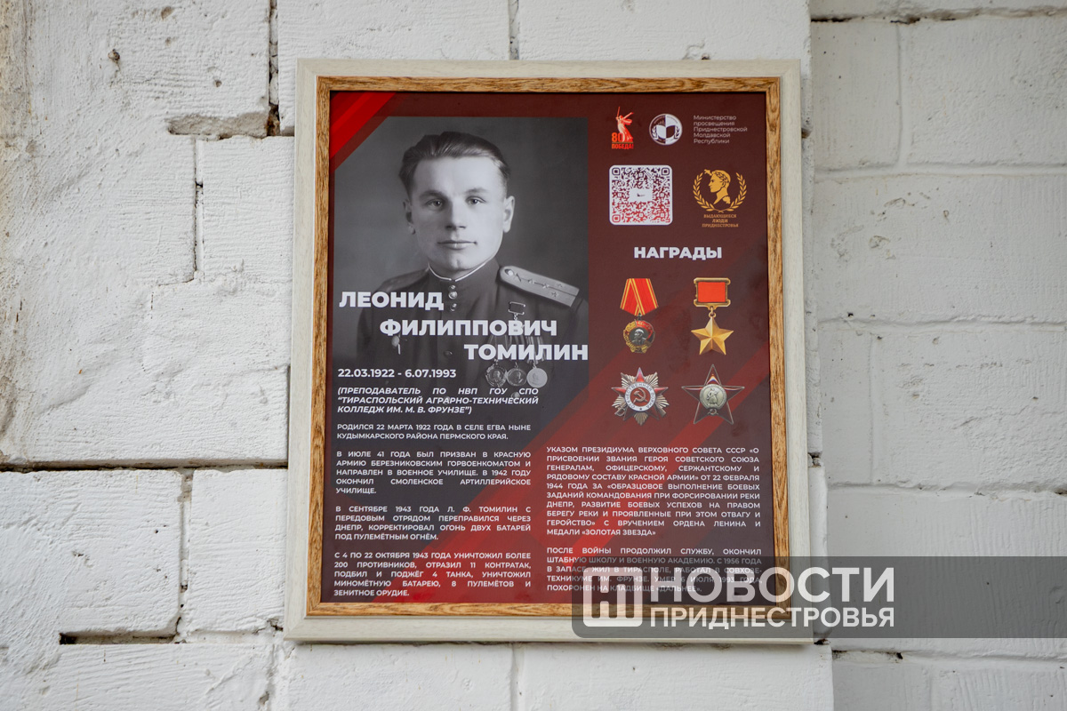 Тирасполь, 21 мая. /Новости Приднестровья/. В аграрно-технологическом колледже города Тирасполя открыли информационный стенд, посвященный Герою Советского Союза Леониду Филипповичу Томилину. Его установили в рамках проекта Министерства просвещения «Выдающиеся люди Приднестровья». На стенде содержится информация о герое и QR-код со ссылкой на Приднестровский исторический портал.