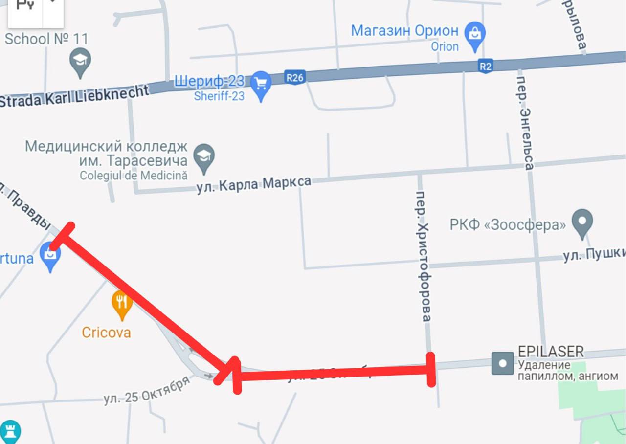 Тирасполь, 11 июня. /Новости Приднестровья/. 14 июня в Тирасполе с 9:00 будет полностью перекрыто движение транспорта от улицы Правды (торговый центр «Фортуна») до улицы 25 Октября (Первый Приднестровский телеканал).