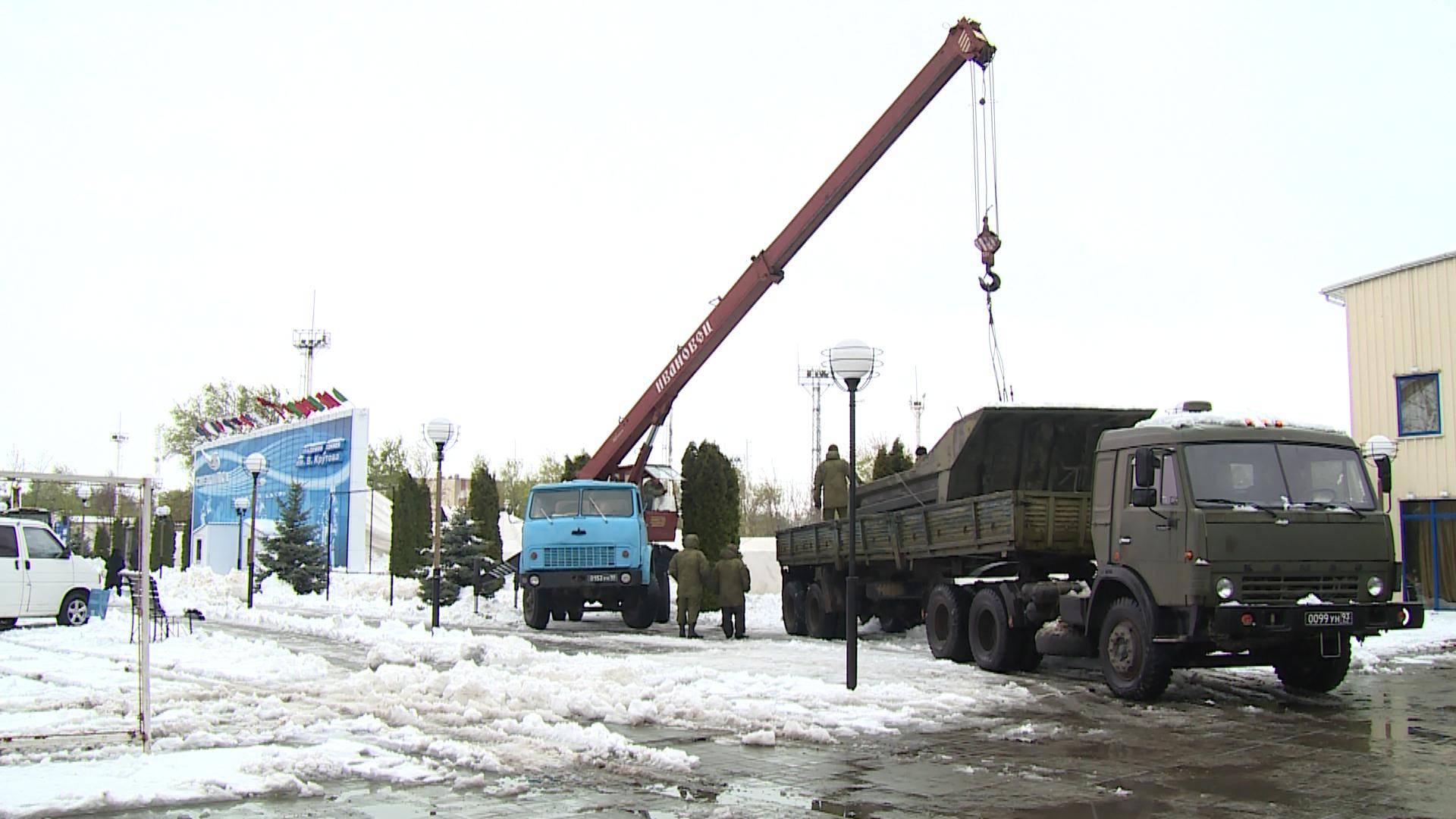 В настоящее время военослужащие ОГРВ помогают аккуратно очищать купол от снега, чтобы ещё больше не повредить тент.