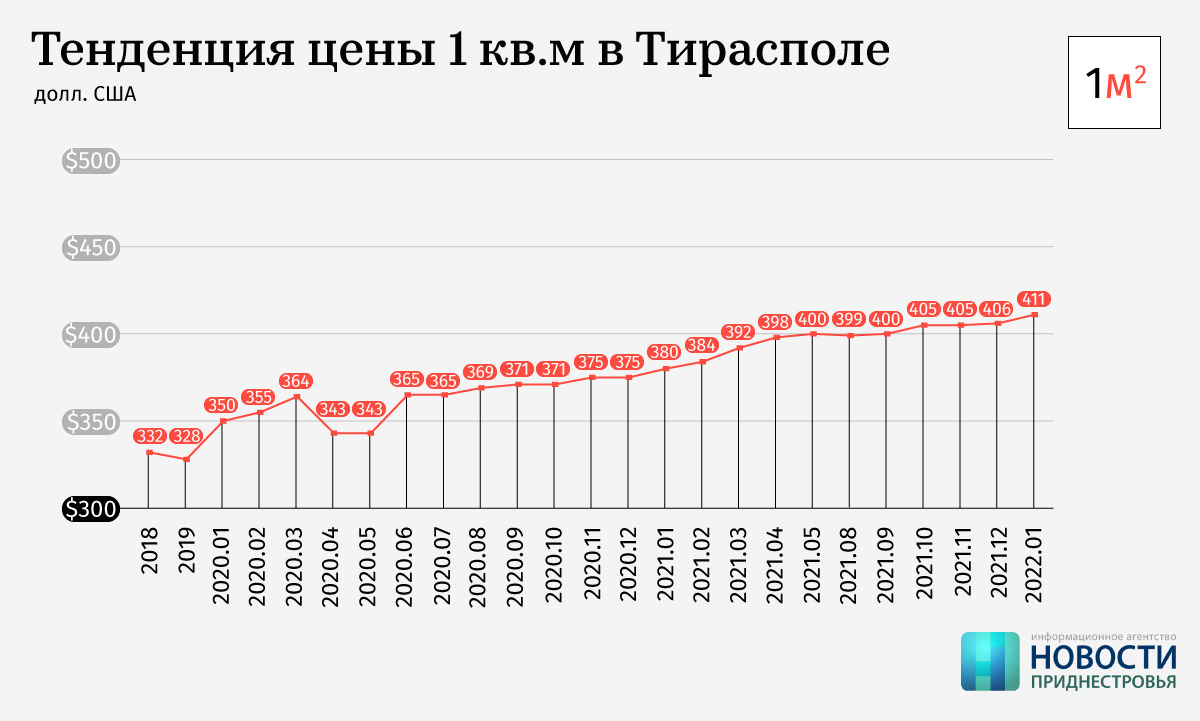По сравнению с 2018 годом, когда ИА «Новости Приднестровья» публиковало предыдущий обзор, в Тирасполе цены на квартиры выросли на 15-20%. Если в 2017 году в среднем цена одного квадратного метра недвижимости в столице составляла около 350 долларов, в 2018 - около 332-х, то к 2022 году квадратный метр подорожал уже до 411 долларов – отмечает Александр Погребной.