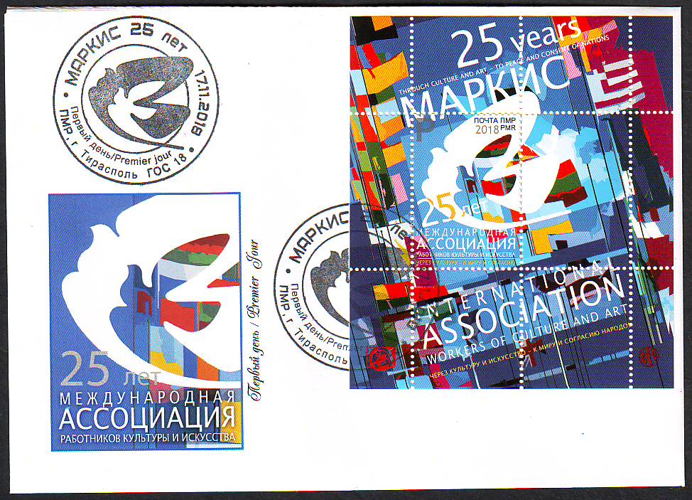Это почтовые блоки «25 лет МАРКИС» (Международная ассоциация работников культуры и искусства) и «20 лет МКС» (Международная космическая станция). Тираж этих блоков по 800 штук.