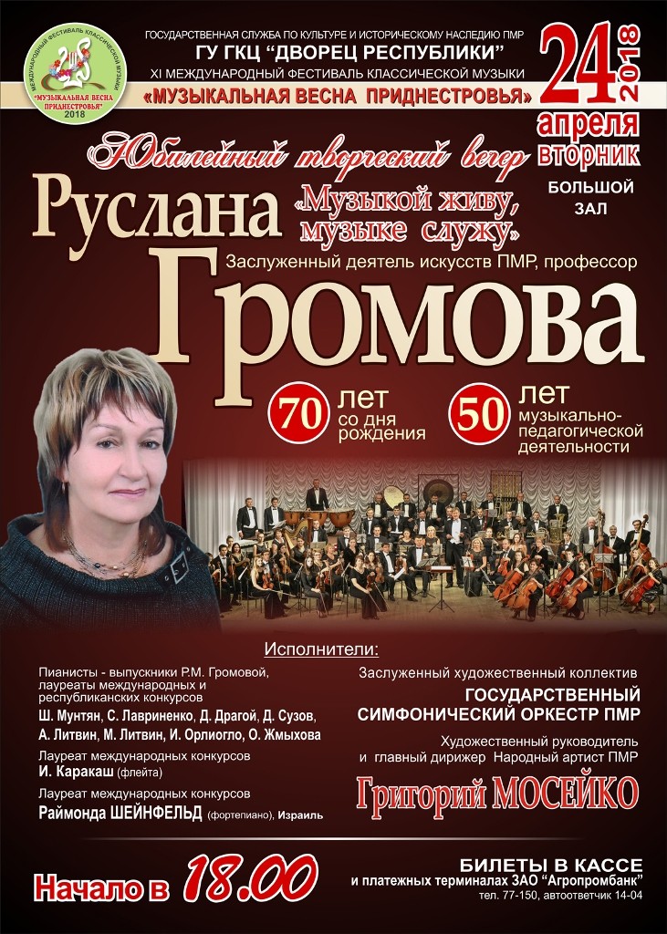 Концертная программа будет ознаменована юбилейным вечером «Музыкой живу, музыке служу», посвящённым Заслуженному деятелю искусств ПМР Руслане Громовой