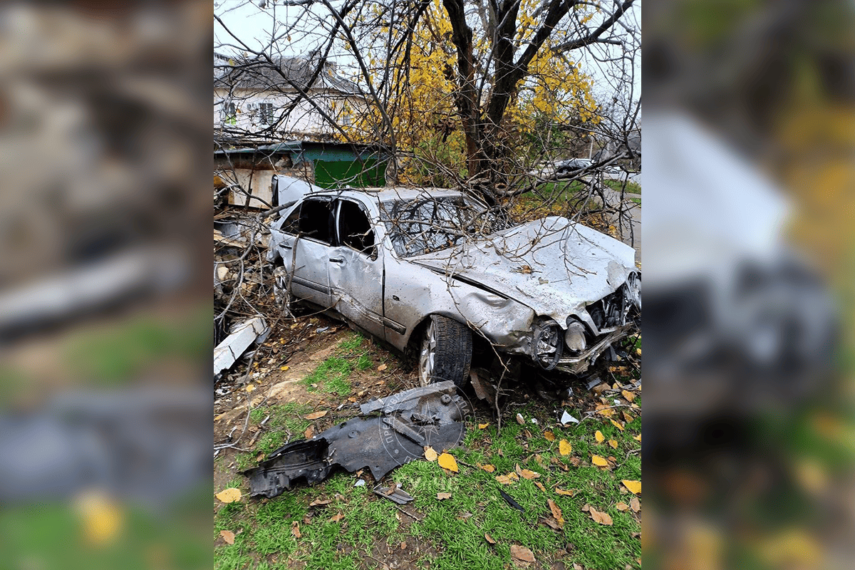 Машина зацепила бордюр, её откинуло на противоположную сторону. «Мерседес» выехал за пределы проезжей части, столкнулся с металлическими воротами гаража, снёс железобетонную опору, влетел в котельцовый забор и дерево.