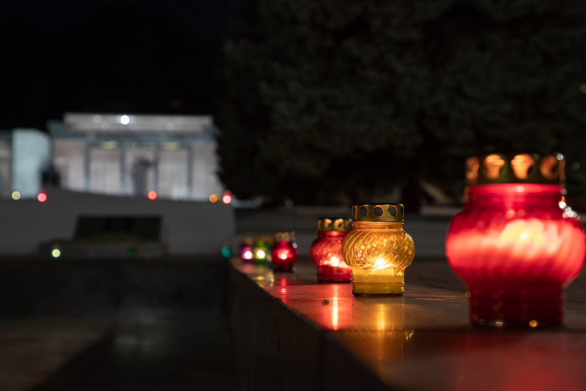 Тихие чарующие голоса солистов государственного хора, наполненные тоской и печалью, звучащие эхом из глубины времени, сопровождали каждое действие, происходящее на месте памяти. Люди оставляли свечи, тем самым выражая почитание и благодарность поколению победителей.