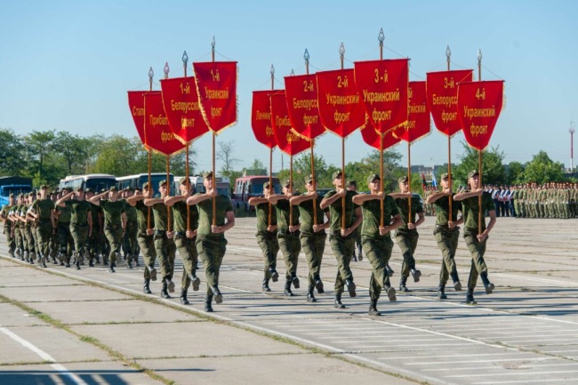 Историческая механизированная колонна со Знаменем Победы и штандарты 13 фронтов возглавили пешие парадные расчёты. Далее прошагали в традиционных коробках более тысячи военнослужащих и воспитанников образовательных учреждений, подведомственных силовым структурам.