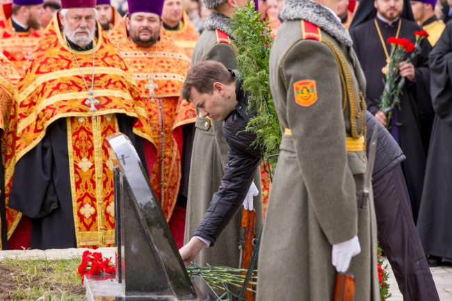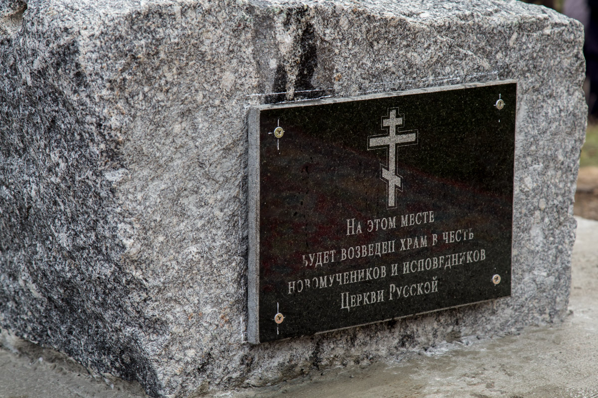 Затем Глава государства, руководители органов государственной власти, представители духовенства, общественных организаций, родственники репрессированных приняли участие в церемонии освящения камня для закладки Храма в честь новомучеников и исповедников Церкви Русской.