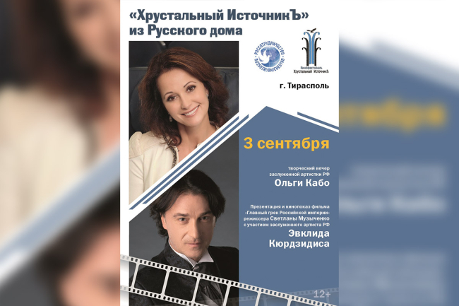 Тирасполь, 1 сентября. /Новости Приднестровья/. 3 сентября в столичном кинотеатре «Тирасполь» пройдёт показ биографического фильма «Главный грек Российской Империи», а также творческая встреча со зрителями заслуженных артистов Российской Федерации Ольги Кабо и Эвклида Кюрдзидиса. Мероприятие пройдёт в рамках открытого фестиваля популярных киножанров «Хрустальный ИсточникЪ» при поддержке представительства Россотрудничества.
