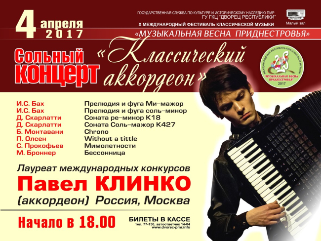 Тирасполь, 4 апреля. /Новости Приднестровья/. Сольный концерт «Классический аккордеон» пройдет сегодня в 18.00 в большом зале Дворца Республики.