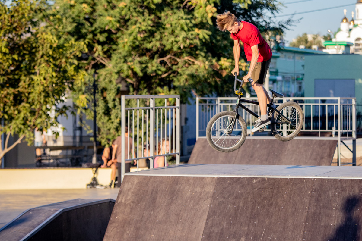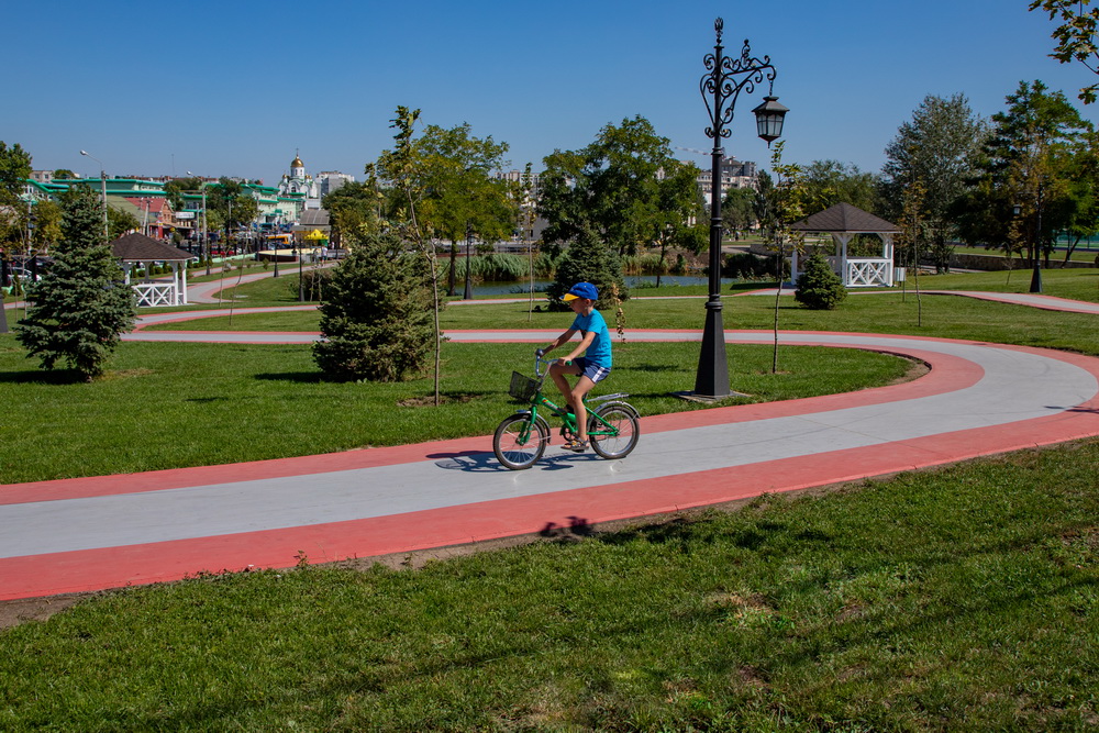 В западной части парка расположены поля для игры в мини-футбол, волейбол и баскетбол, беговая дорожка, площадки для занятий воркаутом и настольным теннисом, шахматное поле с ростовыми фигурами, а также километровая тропа Здоровья и самый большой в республике роллердром.