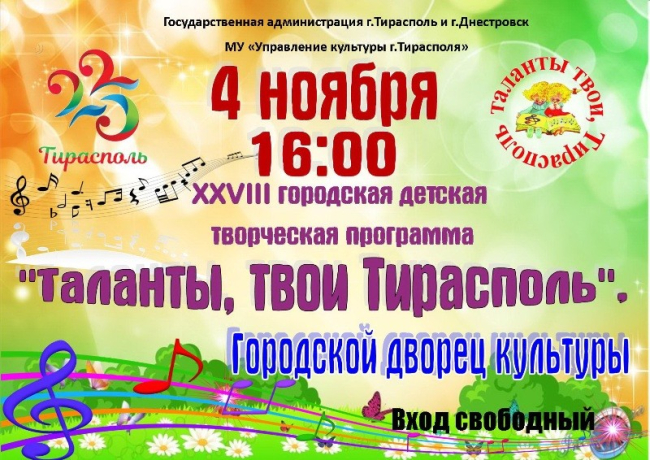 Тирасполь, 2 ноября. /Новости Приднестровья/. 4 ноября в столичном Дворце культуры состоится XXVIII церемония чествования лучших детских творческих коллективов города «Таланты твои, Тирасполь».