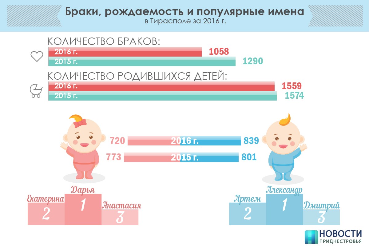 Тирасполь, 15 февраля. /ИА «Новости Приднестровья»/. В 2016 году жители Тирасполя зарегистрировали 1 058 браков, тогда как годом ранее эта цифра достигала 1 290. При этом число детей, родившихся в прошлом году, лишь с небольшой разницей уступает 2015 году.