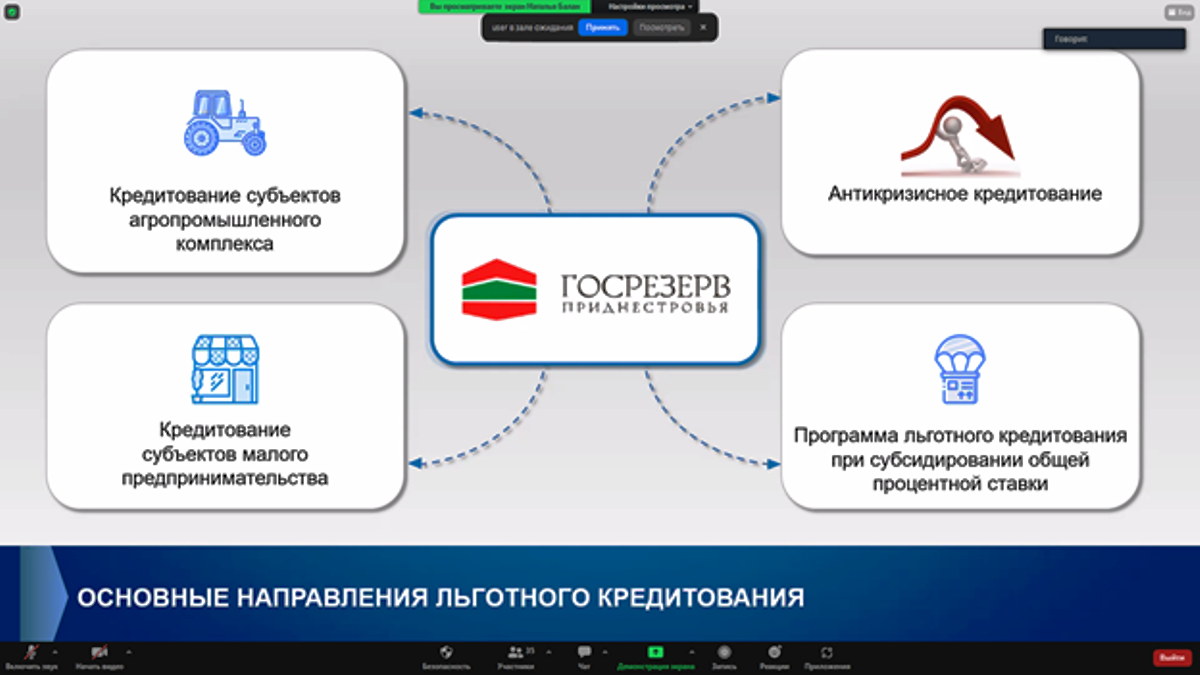 Тирасполь, 30 июня. /Новости Приднестровья/. В Торгово-промышленной палате ПМР прошёл онлайн-семинар на тему льготного финансирования бизнеса в кризисных условиях. Это часть проекта «Функционирование бизнес-школы». Среди спикеров – директор Фонда госрезерва Наталья Балан и представитель Приднестровского Сбербанка Валерий Бричко. Они рассказали о различных программах кредитования, которыми сегодня может воспользоваться бизнес в Приднестровье.
