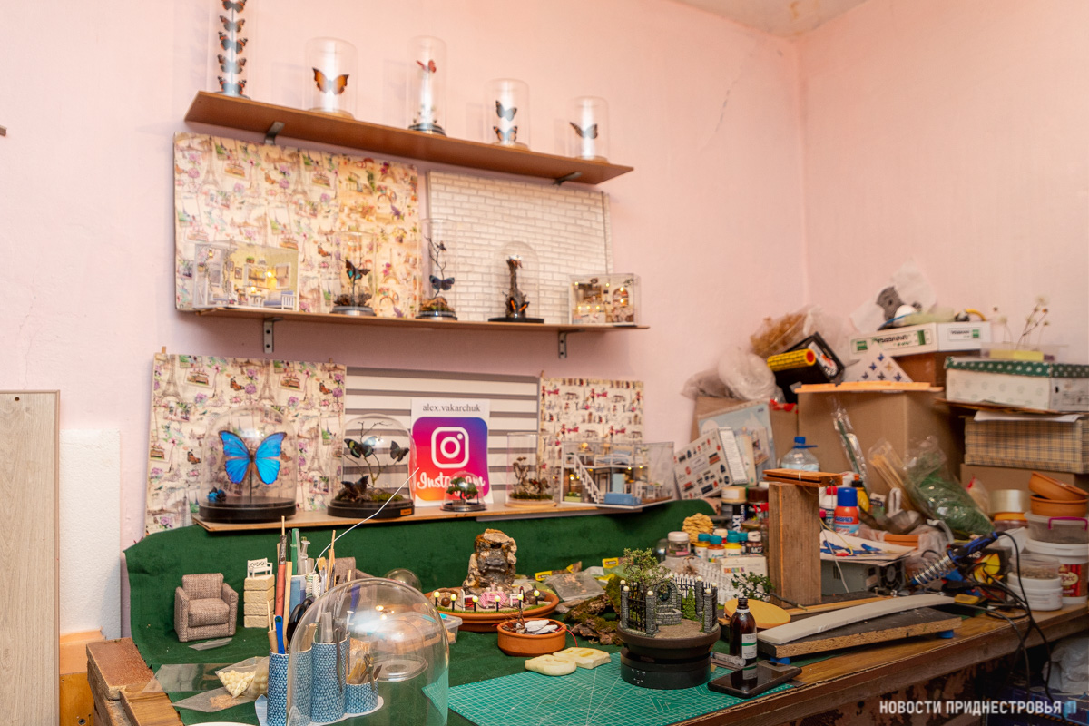 «Мне было 10 лет, когда мне подарили железную дорогу. И там на коробке был нарисован поезд, который заезжал в тоннель, вокруг была зелень, деревья. И я смотрел и понимал, что это же тоже все сделано, только в маленьком размере. Я был настолько впечатлен. Вот тогда, еще в том возрасте, в меня было опущено семечко, которое спустя время проросло и вот во что выросло», - делится Алексей, показывая миниатюрную комнату.