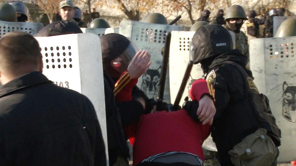 Учения проходили в два этапа. На первом, по легенде, бойцы сводного отряда продемонстрировали навыки пресечения массовых беспорядков на открытом пространстве. Так называемые группы изъятия выявляют неформальных лидеров, зачинщиков бунта, изымают их из толпы и с помощью группы сопровождения конвоируют в автомобиль.