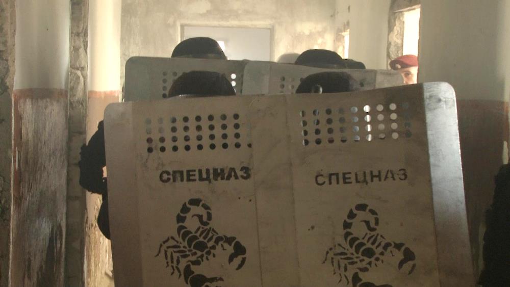 «На втором этапе одна из групп осуждённых условно забаррикадировалась в жилом здании, а руководитель операции принял решение о проведении штурма, конвоировании осуждённых в ШИЗО. Силами отряда спецназначения были продемонстрированы различные виды входа в здание на 1-ом и 2-ом этажах, а также в самом помещении», – прокомментировал заместитель командира по работе с личным составом отряда специального назначения «Скорпион» Роман Стариков.