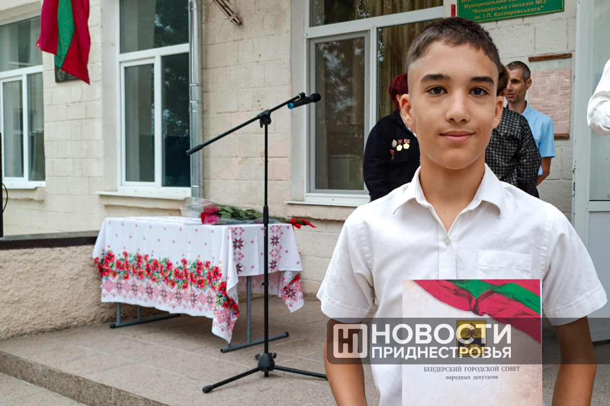 В День знаний школьников не только поздравляли с началом учебного года, но и награждали. Ученику 7-го класса Тимофею Евчеву за участие в международном патриотическом конкурсе «Песни Великой Отечественной войны» вручили благодарственное письмо от Бендерского городского Совета народных депутатов.