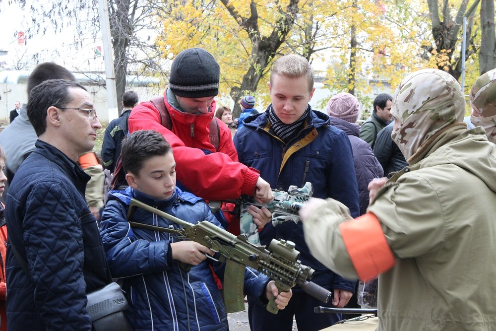В отличие от традиционных экспозиций правило «руками не трогать» здесь было неактуально. Сфотографироваться на БТР-е, погладить служебную собаку, разобрать автомат и даже испытать захватывающий аттракцион, имитирующий прыжок с парашюта, – всё это можно было сделать, лишь дождавшись своей очереди.