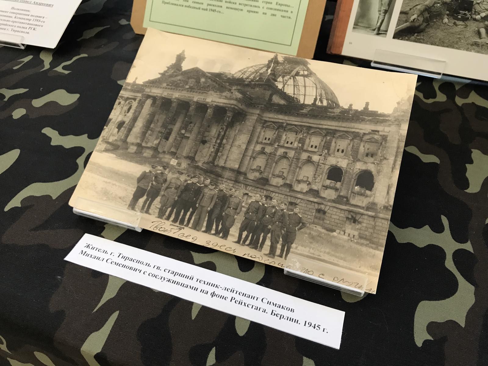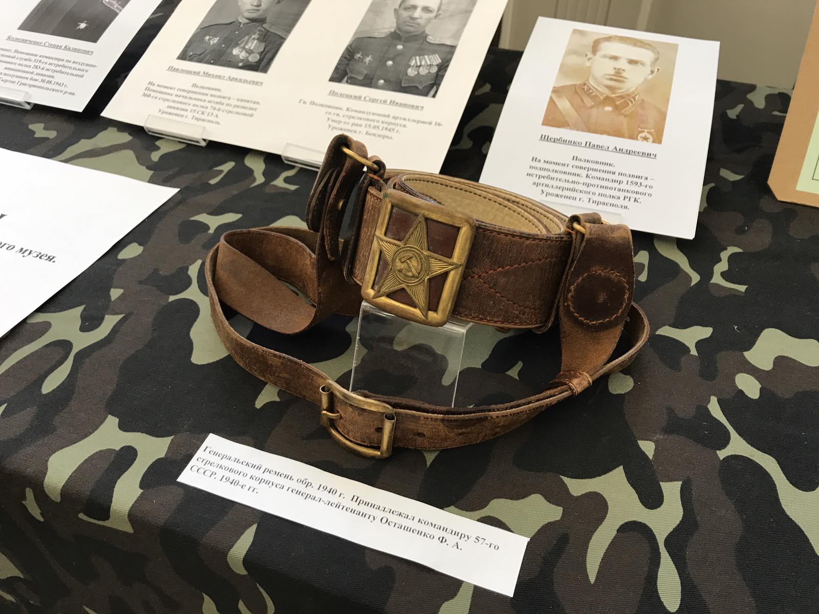 Здесь можно увидеть винтовку Мосина образца 1891 года, противотанковое ружье системы Дегтярева и пистолет-пулемёт системы Шпагина 1941 года, генеральский ремень образца 1940 года, который принадлежал командиру 57-го стрелкового корпуса генерал-лейтенанту Федору Осташенко, другие экспонаты и фотоснимки. Для посетителей собрана информация об уроженцах Приднестровья, удостоенных звания Героя Советского Союза в годы Великой Отечественной войны, сообщается на сайте Верховного Совета.