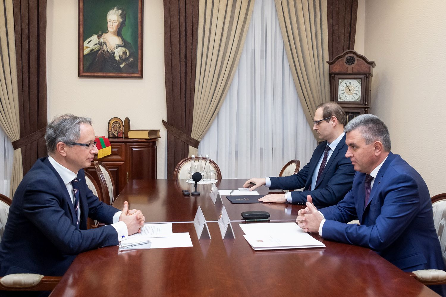 Встреча Президента ПМР с главой миссии ОБСЕ прошла в рабочем кабинете главы приднестровского государства. Участие в беседе принял также министр иностранных дел ПМР Виталий Игнатьев.