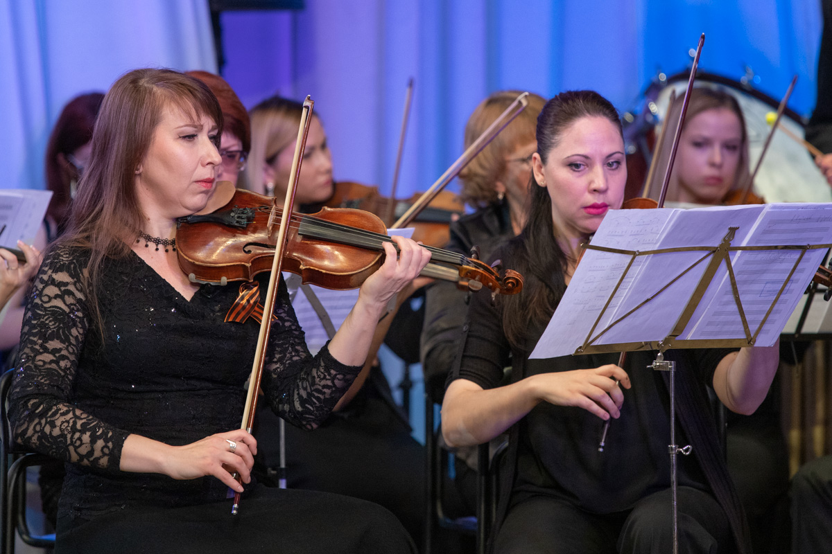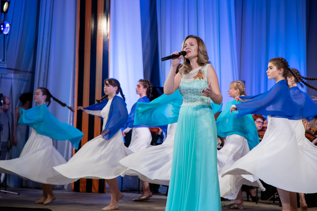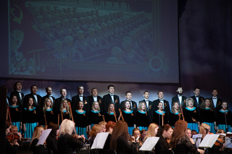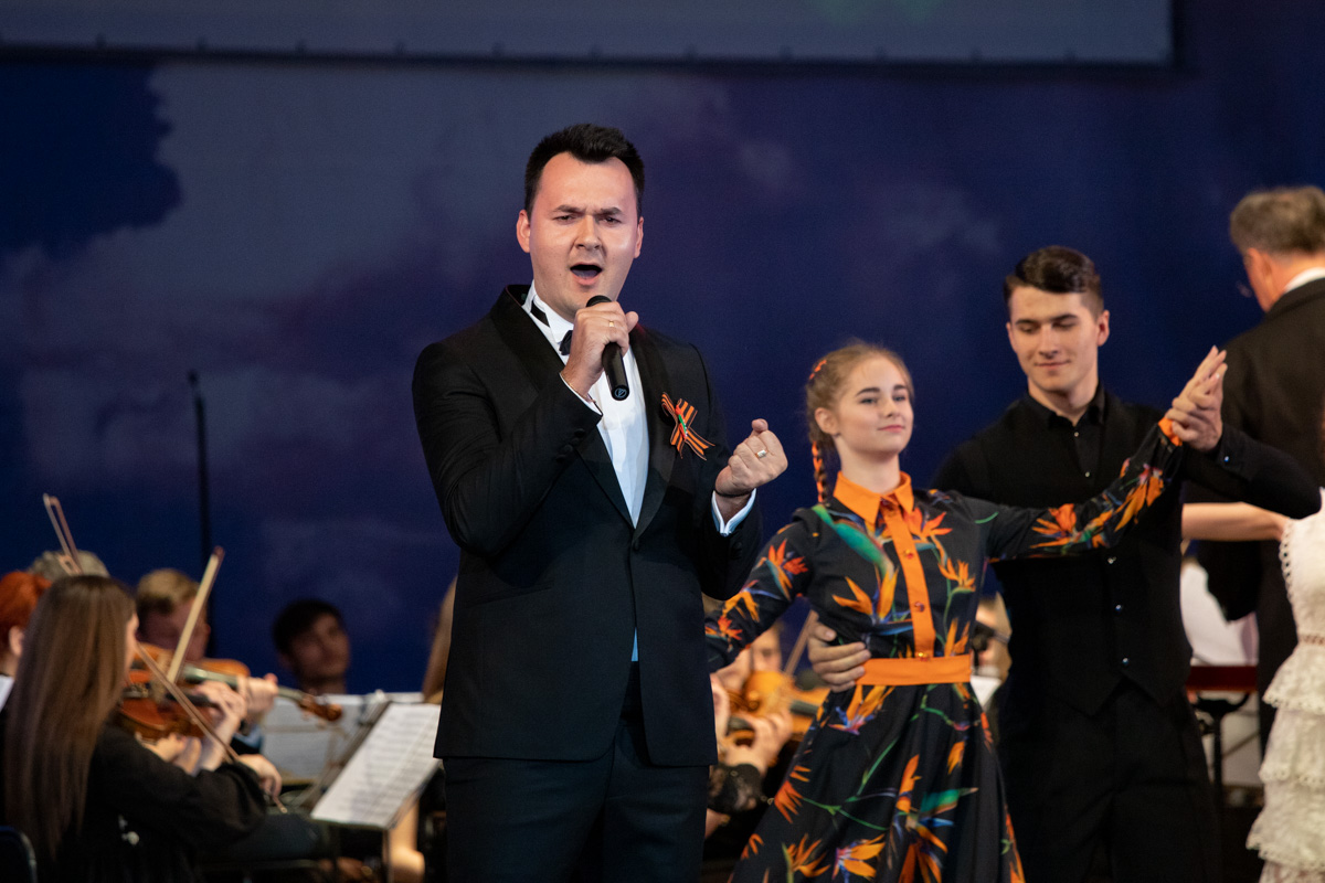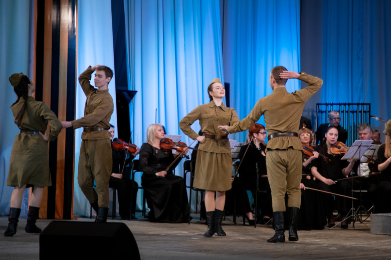 Далее мероприятие продолжилось выступлениями государственных и городских коллективов. Со сцены звучали песни военных лет в исполнении артистов государственного хора и других под аккомпанемент симфонического оркестра под руководством Григория Мосейко.