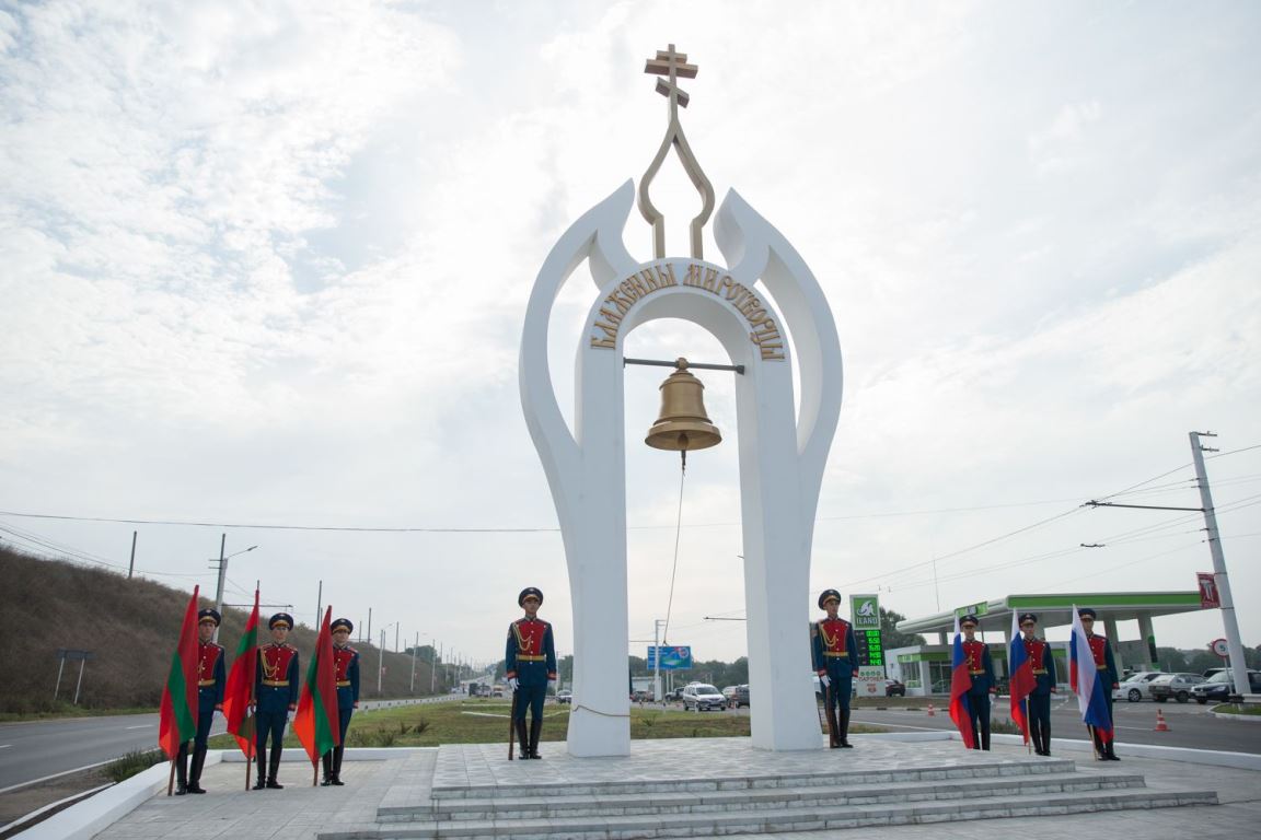 Под аркой, выполненной в виде крыльев ангела, подвешен колокол, символизирующий благую весть о мире. Сегодня в него ударили Президент Приднестровья и временный поверенный в делах России в Молдове.
