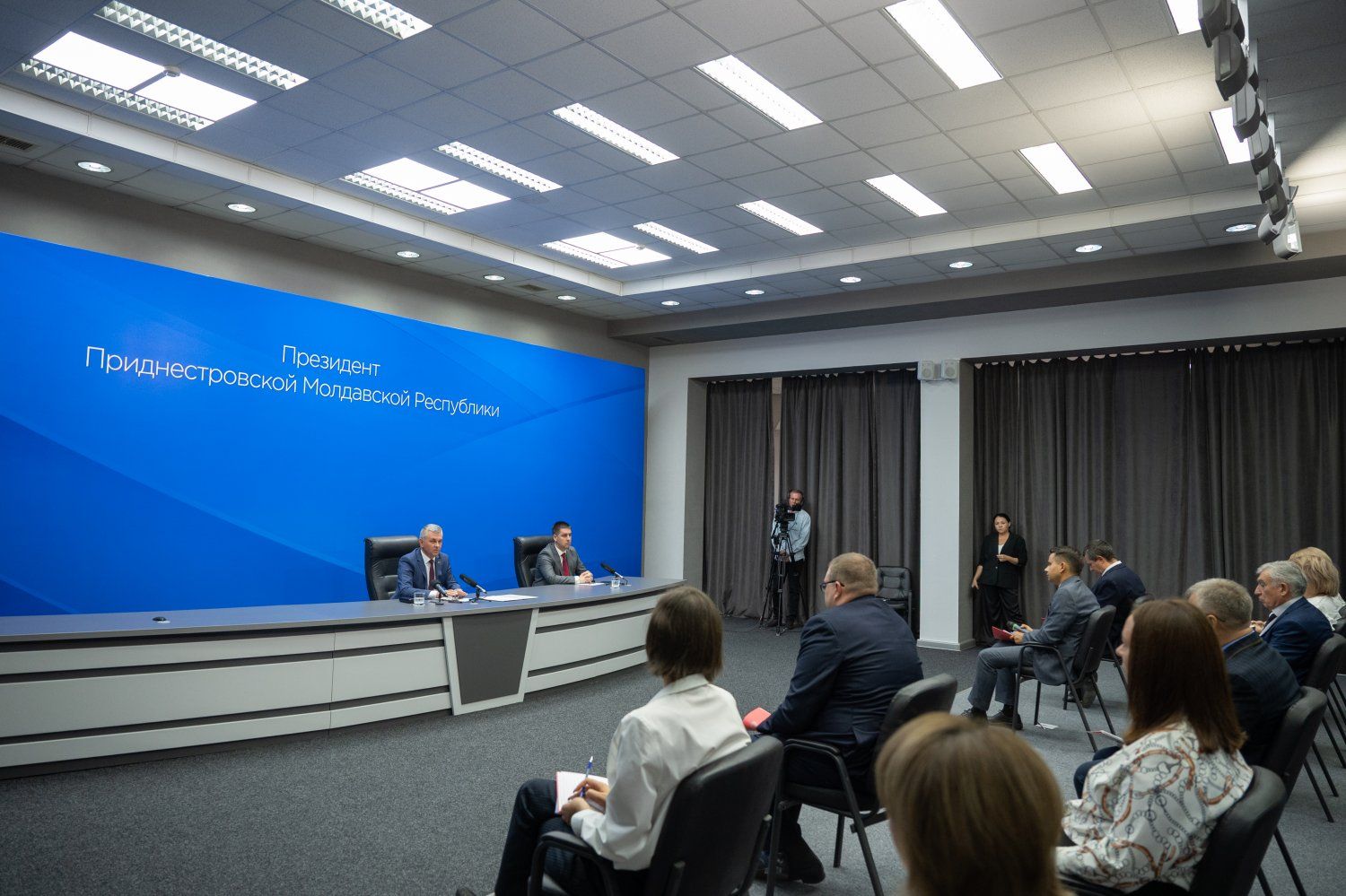 Тирасполь, 1 сентября. /Новости Приднестровья/. Накануне Дня Республики глава приднестровского государства Вадим Красносельский провел встречу с представителями масс-медиа. Общались на площадке Администрации Президента ПМР. Разговор продлился порядка двух часов. Говорили о геополитической ситуации, перспективах возобновления переговорного процесса, об обеспечении безопасности приднестровцев, о целесообразности пролонгации действия желтого кода террористической опасности, сообщает президентская пресс-служба.
