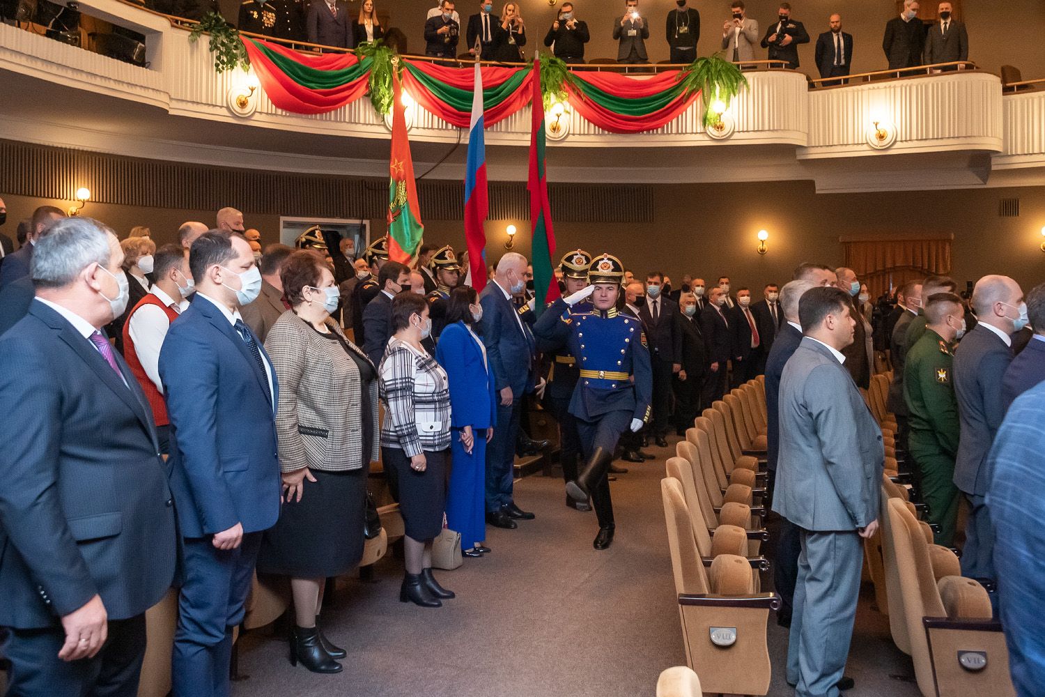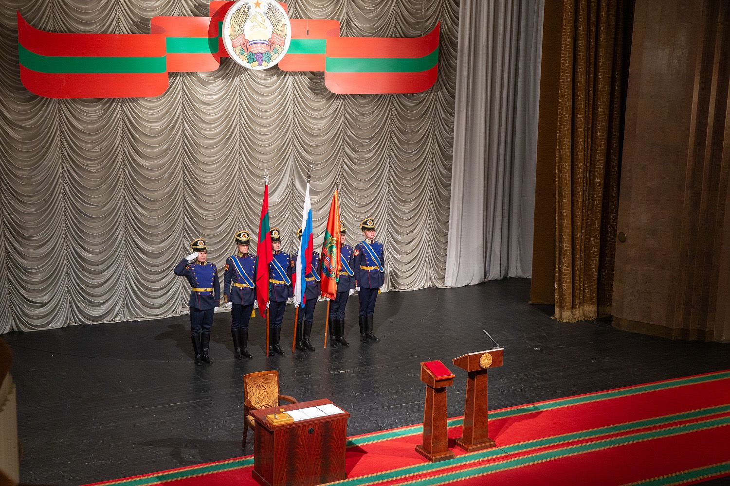 Церемония принесения присяги народу Приднестровья – инаугурация – традиционно проходит в большом зале Государственного театра им. Н. Аронецкой. Место выбрано неслучайно. Именно здесь 2 сентября 1990 года в ходе II Чрезвычайного съезда народных депутатов всех уровней Приднестровья было провозглашено суверенное государство ПМССР. Действующее название страны – Приднестровская Молдавская Республика – было официально закреплено в ноябре 1991 года. Неделей ранее, 22 октября, Верховный Совет принял закон о выборах Президента. Это было первое упоминание данной должности в правовом поле республики. Руководителя страны впервые избрали 1 декабря 1991 года. Тогда выбор народа пал на одного из основателей республики Игоря Смирнова. Первый Президент ПМР – один из почетных гостей сегодняшней торжественной церемонии.