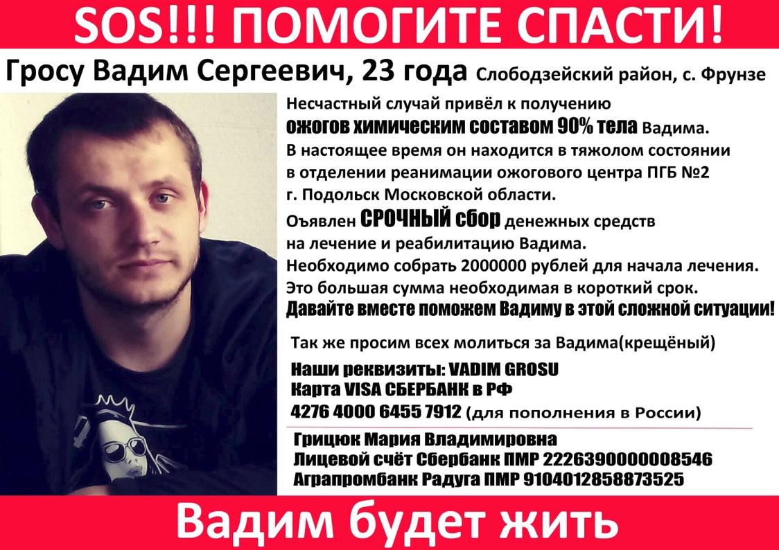Слободзейский район, 27 июня. /Новости Приднестровья/. Жителю села Фрунзе Слободзейского района Вадиму Гросу нужна помощь. В минувший понедельник 23-летнего парня с сильными ожогами доставили вертолётом в больницу из Дедовска в Подольск (Россия). Несчастный случай на рабочем месте привел к получению ожогов 93% тела химическим составом.