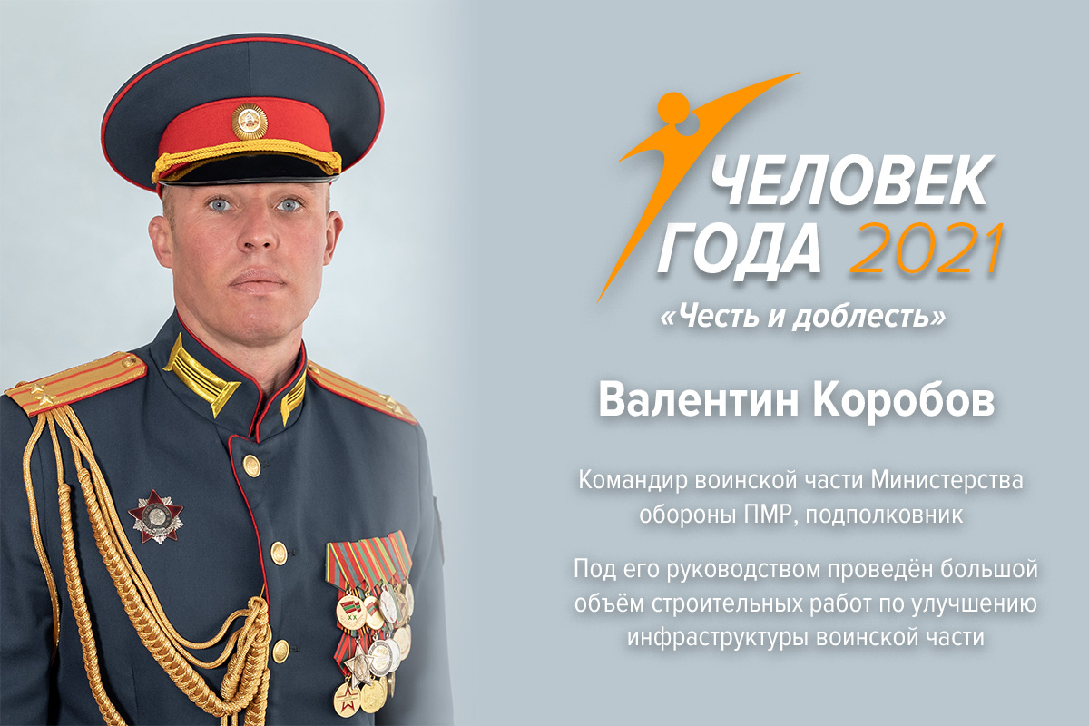 Тирасполь, 26 февраля. /Новости Приднестровья/. Заслуженную награду в номинации «Честь и доблесть» конкурса «Человек года – 2021» получил командир воинской части Министерства обороны ПМР подполковник Валентин Коробов.