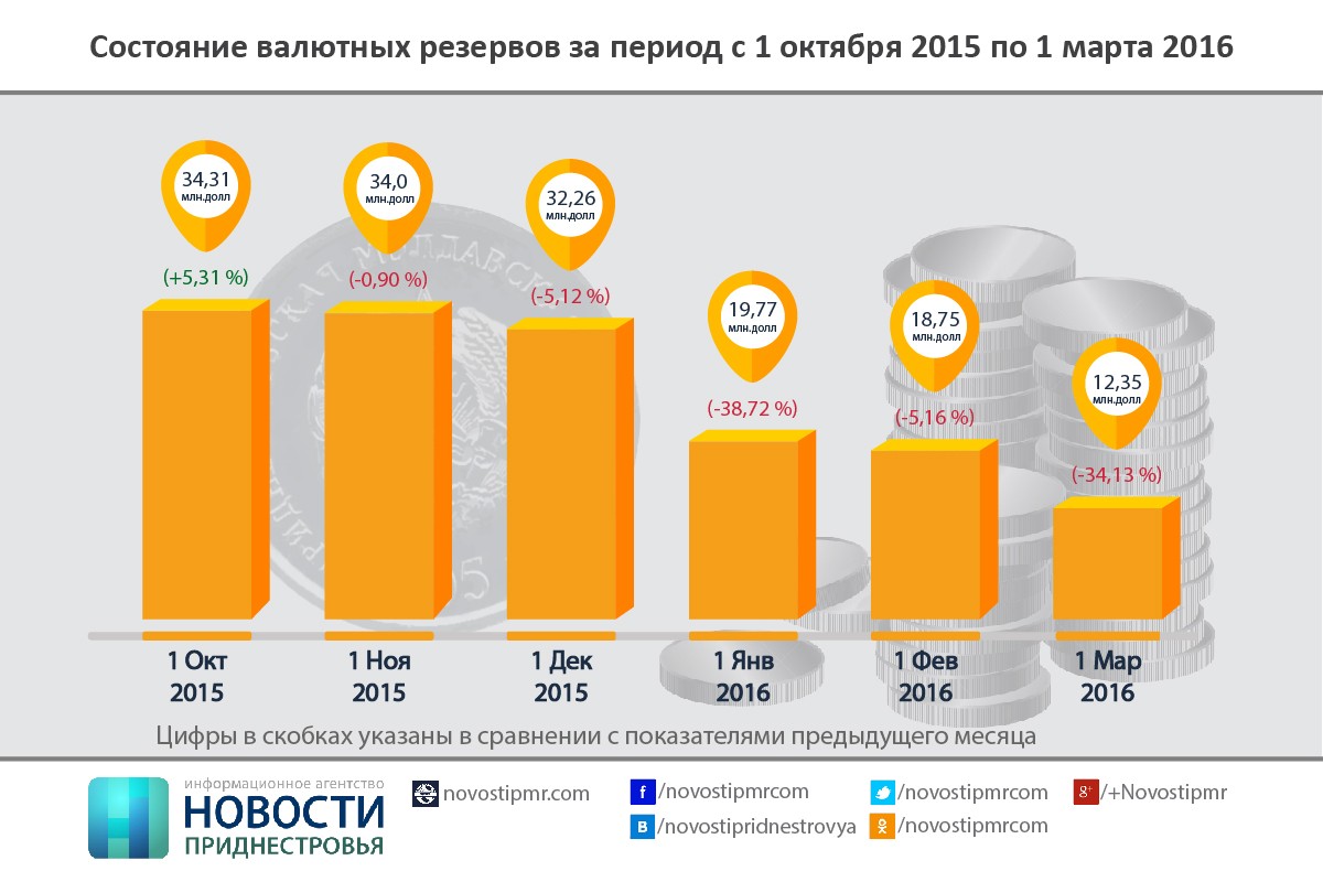 По состоянию на 1 марта 2016 года валютные резервы Приднестровской Молдавской Республики сложились в сумме 12,35 млн в долларовом эквиваленте, сократившись за один месяц на $ 6,4 млн. По данным отдела общественных коммуникаций ПРБ, в феврале этот показатель составлял 18,75 млн долл. При этом за последние 3 месяца валютные резервы страны прохудились в 2,5 раза. (В декабре резервы составляли 32,26 млн долл.).