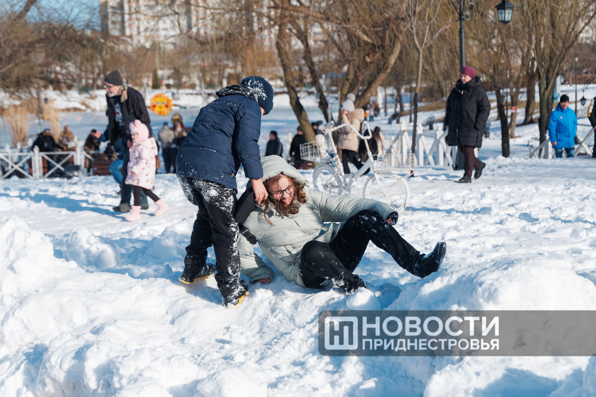 В парке было довольно шумно: дети вовсю играли в снежки и лепили снежную бабу. Это и неудивительно, ведь нынешняя зима выдалась для Приднестровья особенно морозной. Настолько, что десятки людей смогли сегодня покататься по льду замёрзшего озера.