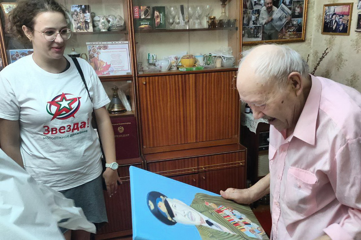 Ребята подарили ветерану его портрет, написанный активисткой движения Ксенией Деменюк, а также его любимый «Пражский» торт.