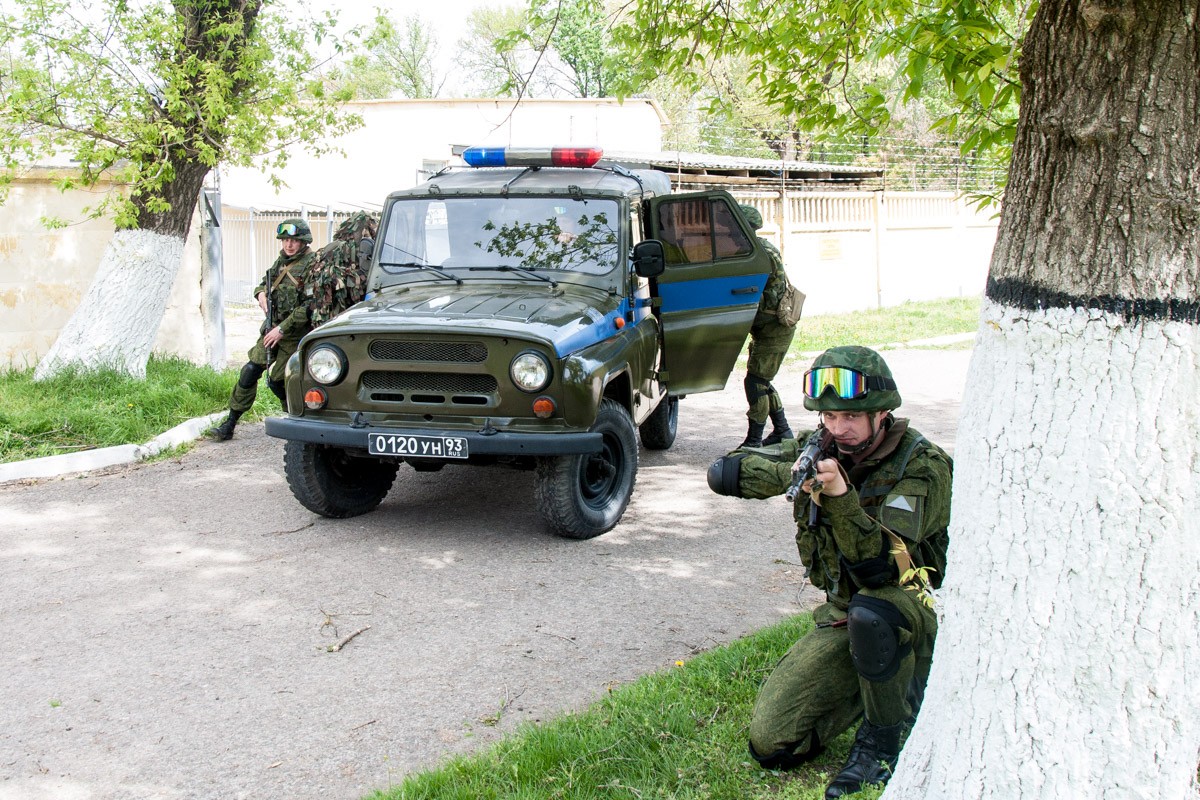 По сценарию тренировки на телефон дежурного поступил сигнал о том, что четыре вооружённых злоумышленника напали на один из контрольно-пропускных пунктов. Военнослужащие тут же были подняты по тревоге. Для устранения террористов в район предполагаемого нападения выдвинулись солдаты и бронированная техника.