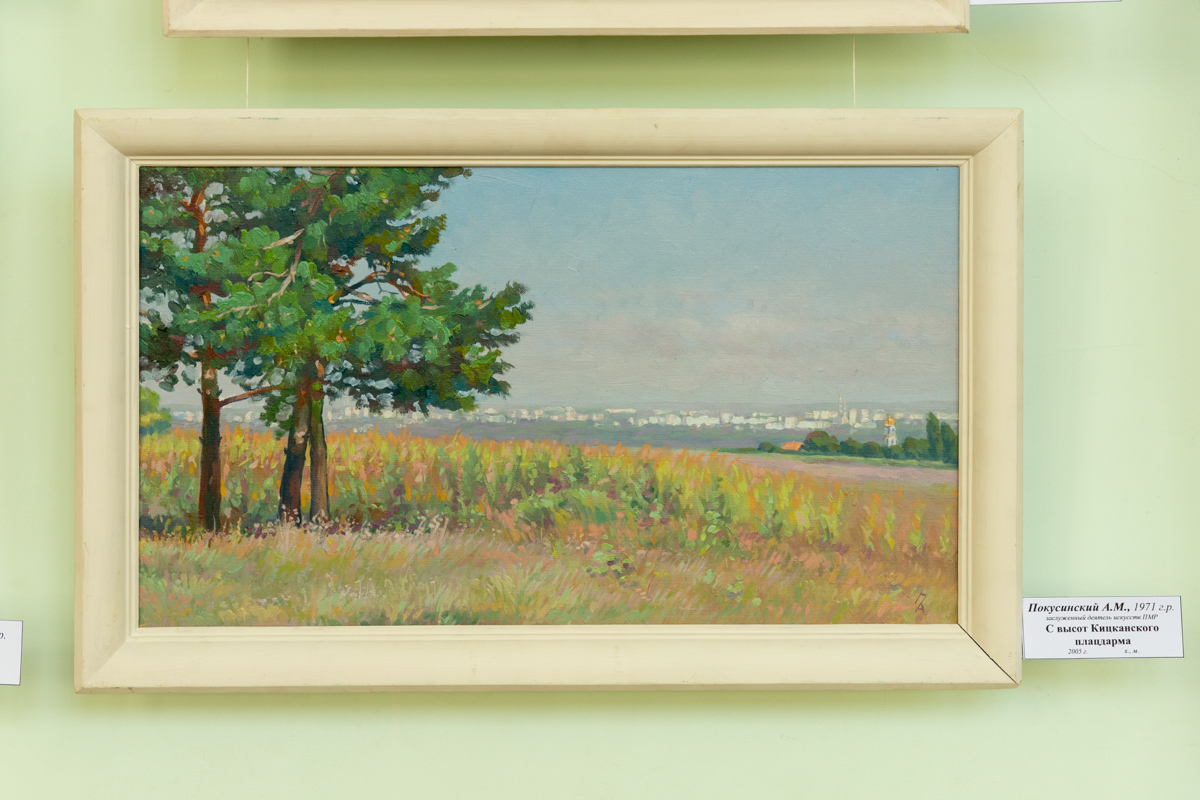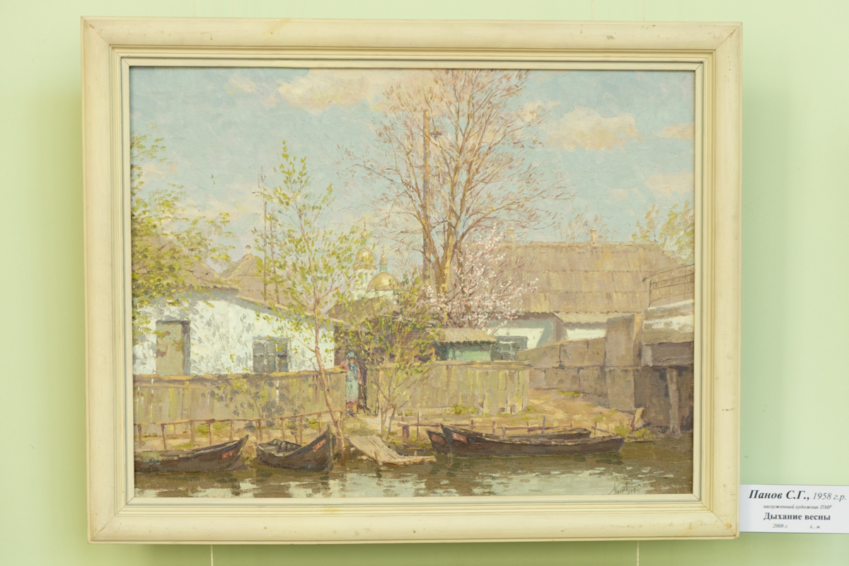 В работах «Православные Кицканы» и «Утро в провинции» заслуженного художника ПМР Евгения Иовицы – яркие пейзажи, словно выложенные живописной мозаикой. Соседствуют с ними произведения реалистической школы заслуженного художника ПМР Сергея Панова «Сельский дворик» и «Тираспольские дали».