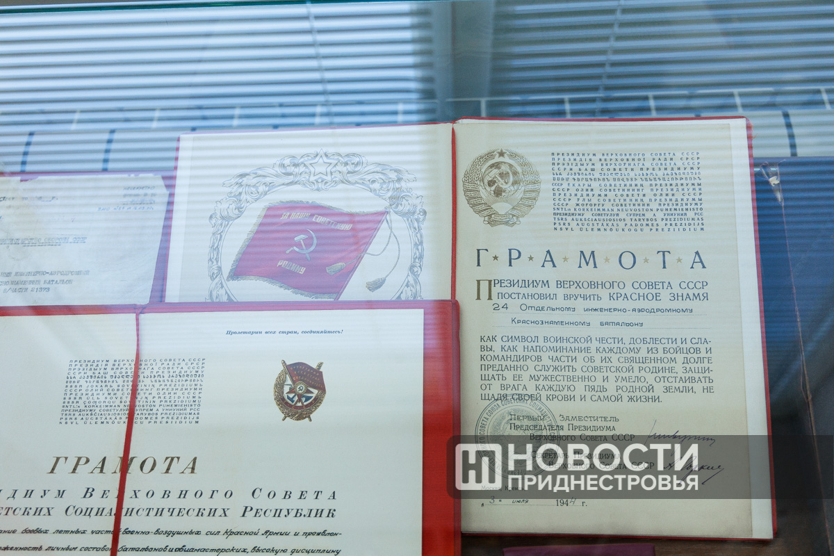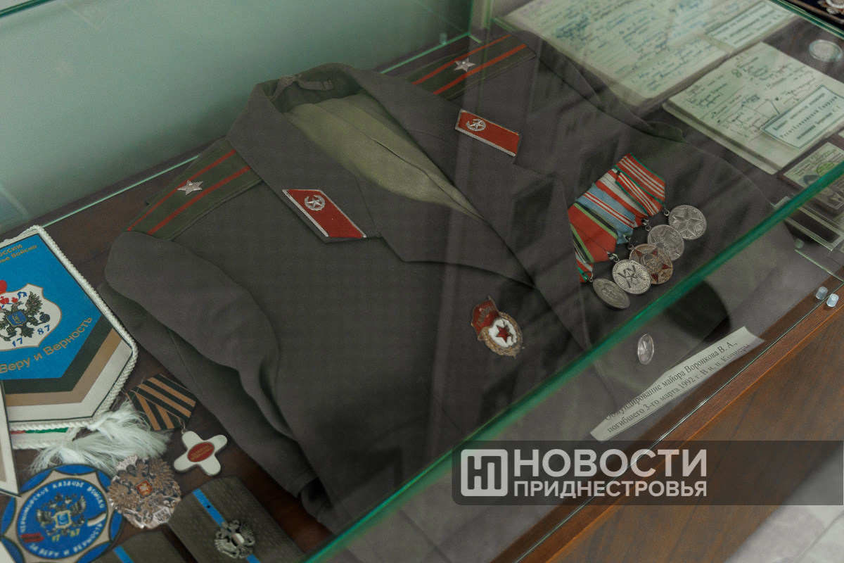 Среди экспонатов – китель командира 1-го батальона Республиканской гвардии майора Василия Воронкова, который 3 марта 1992 года во время боя в Кочиерах, спасая сослуживцев, накрыл своим телом гранату. В соседней витрине – рабочая карта командира Рыбницкого народного ополчения и схема оборонительных позиций на выезде из Бендер.