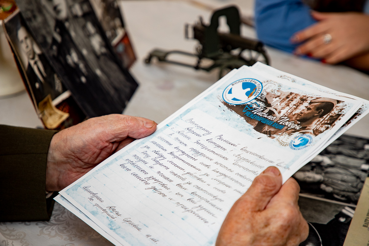 Владимир Иванович прочитал письма с поздравлениями и пожеланиями и рассказал волонтерам о годах, проведенных на фронте, а также о самом главном дне в его жизни – Дне Победы.