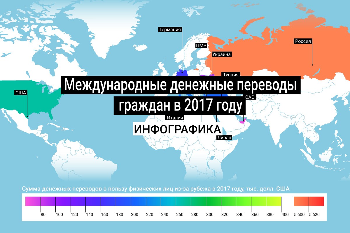 Среди стран дальнего зарубежья по суммам денежных переводов в пользу приднестровцев лидирует Израиль ($4 млн), следом идут США ($3,1 млн), Турция ($2,1 млн) и Италия ($2 млн).