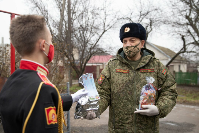 Тирасполь, 28 декабря. /Новости Приднестровья/. Воспитанникам Тираспольского Суворовского военного училища вручили новогодние подарки от Главнокомандующего Вооруженными силами Вадима Красносельского и министра обороны Олега Обручкова. Праздничные презенты получили 276 суворовцев, каждому из них подарок доставили прямо домой. Начальник Суворовского училища Сергей Александров вместе с офицерами проделал путь от Каменского района до Бендер, чтобы лично в руки передать подарки своим подопечным.