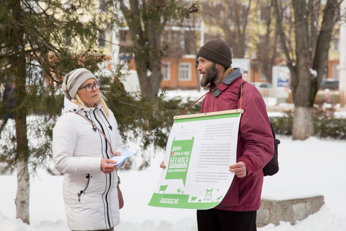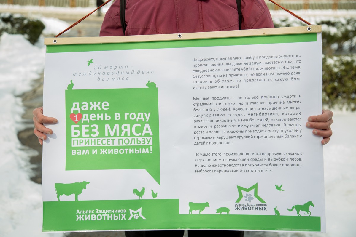 Ежегодно во всём мире 20 марта от продажи мясных продуктов отказываются магазины и рестораны, а от его употребления – миллионы людей. В нашей республике такой опыт ещё не внедрен, но неравнодушных к этой теме немало. В частности, возле госуниверситета был организован пикет.