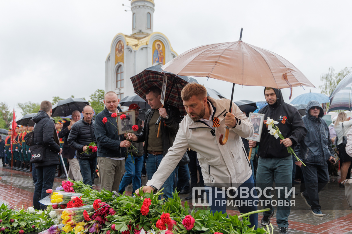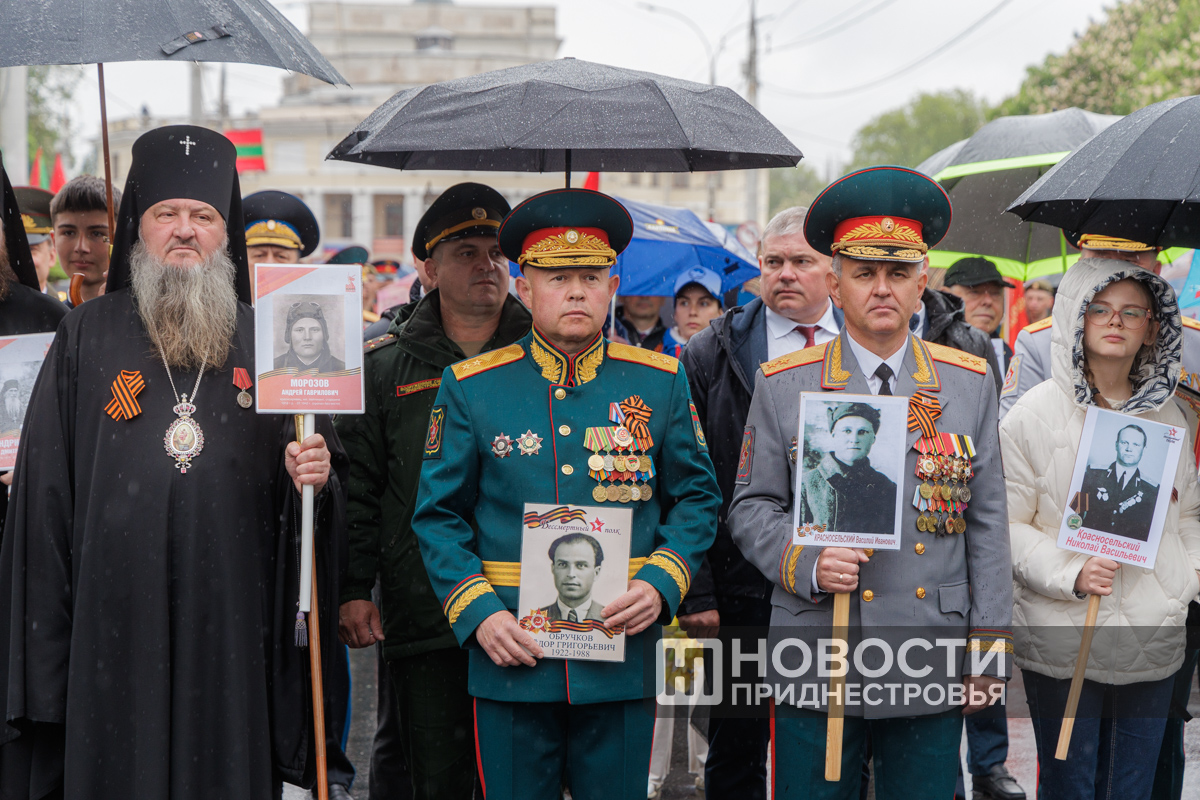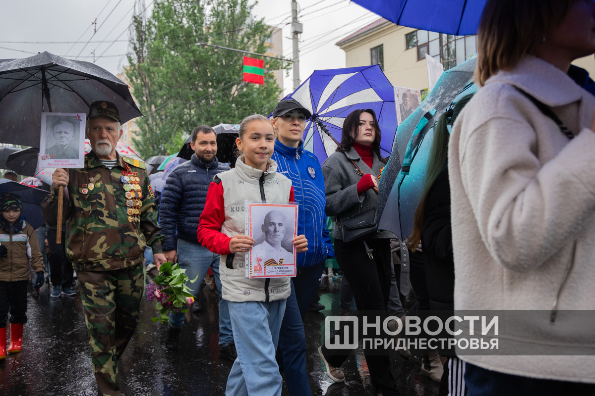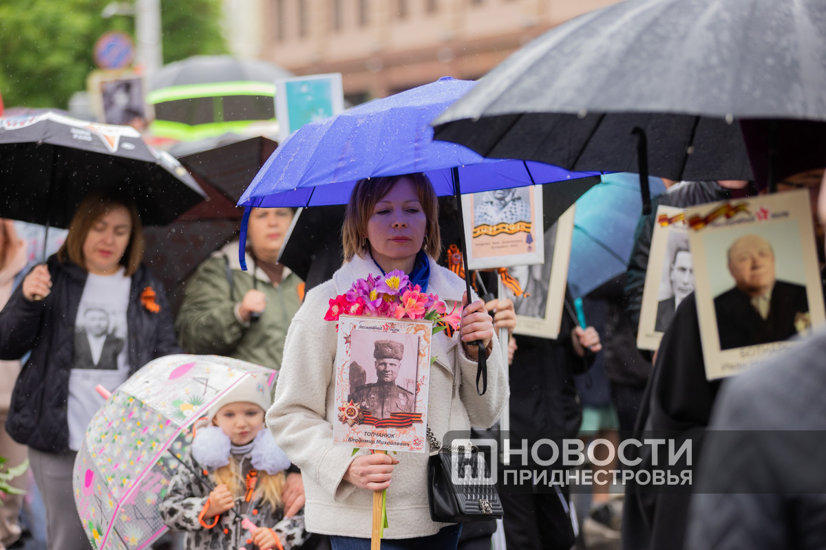 Тирасполь, 9 мая. /Новости Приднестровья/. «Бессмертный полк» вновь прошёл по улицам Тирасполя после перерыва в пять лет. Несмотря на проливной дождь, в шествии приняли участие порядка 35 тысяч человек.