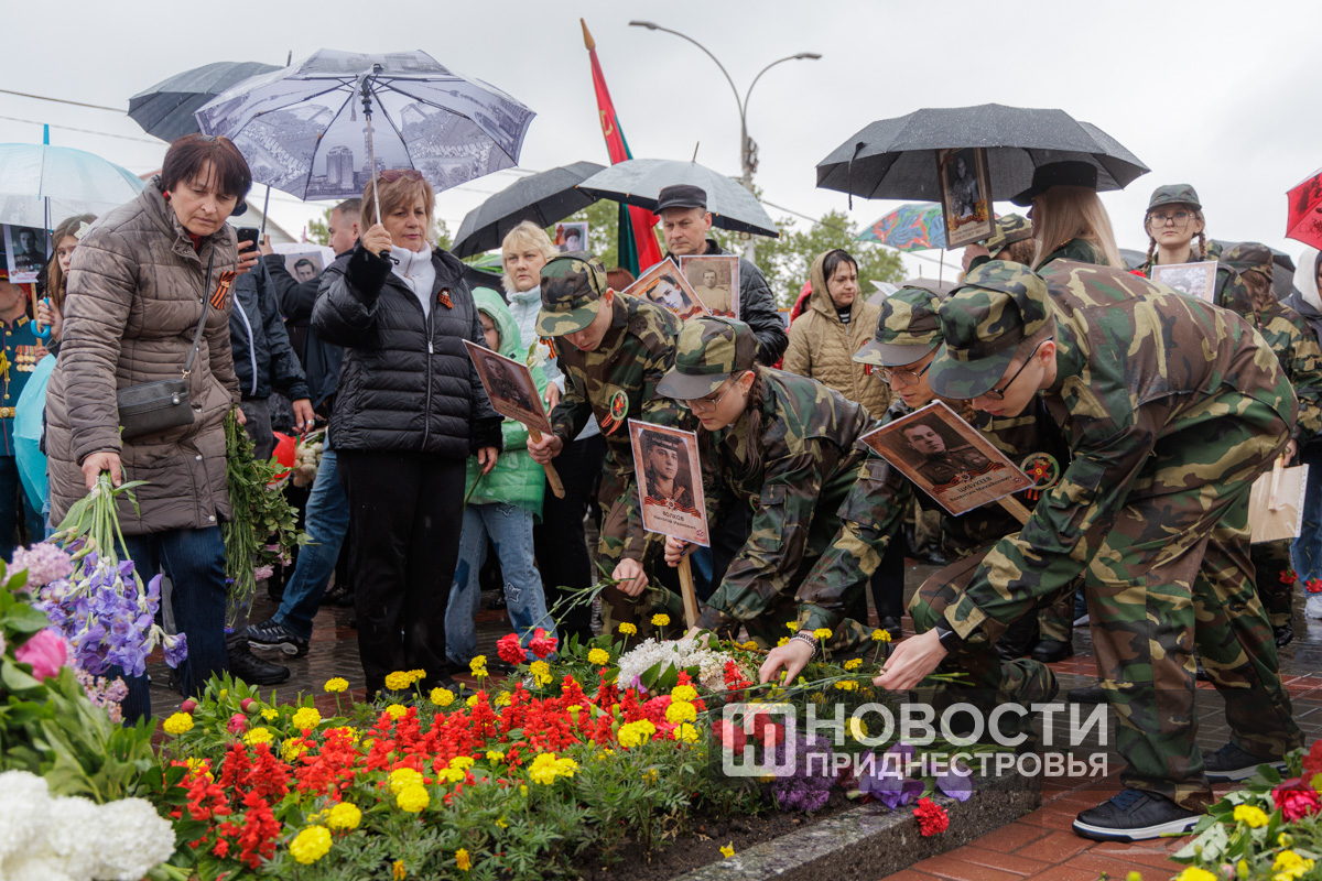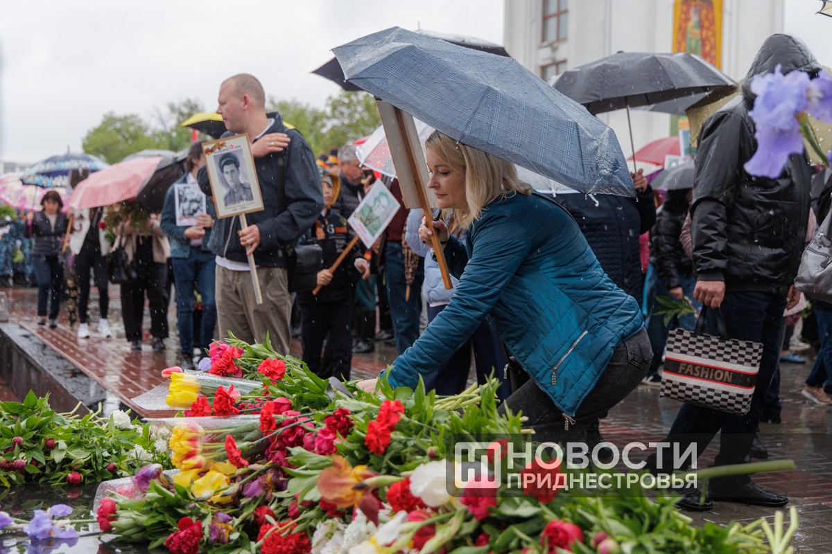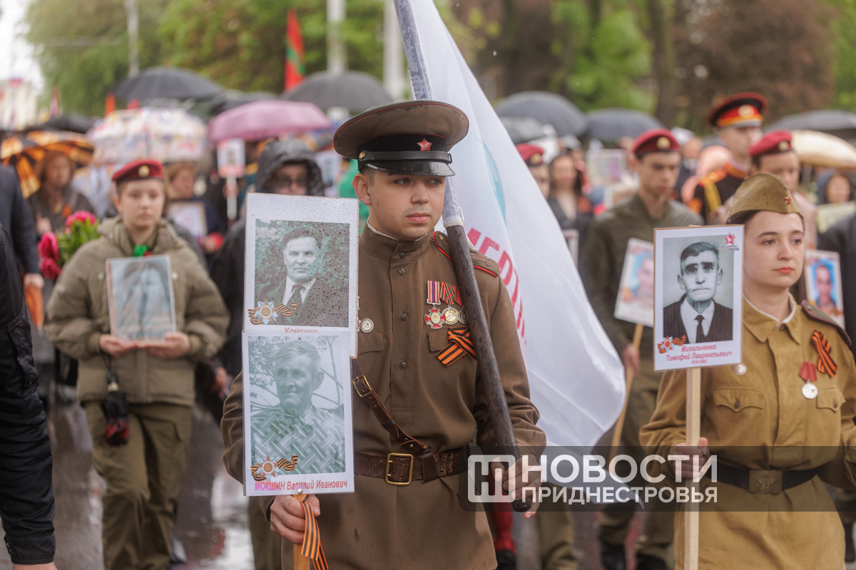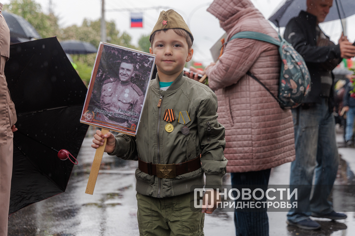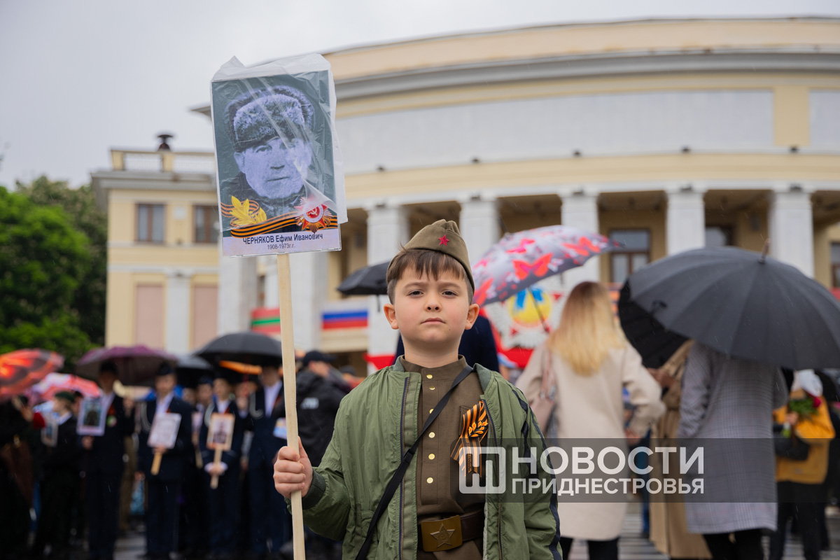 Тирасполь, 9 мая. /Новости Приднестровья/. «Бессмертный полк» вновь прошёл по улицам Тирасполя после перерыва в пять лет. Несмотря на проливной дождь, в шествии приняли участие порядка 35 тысяч человек.