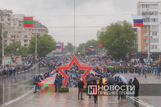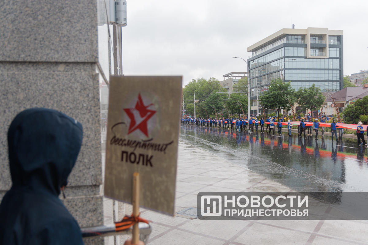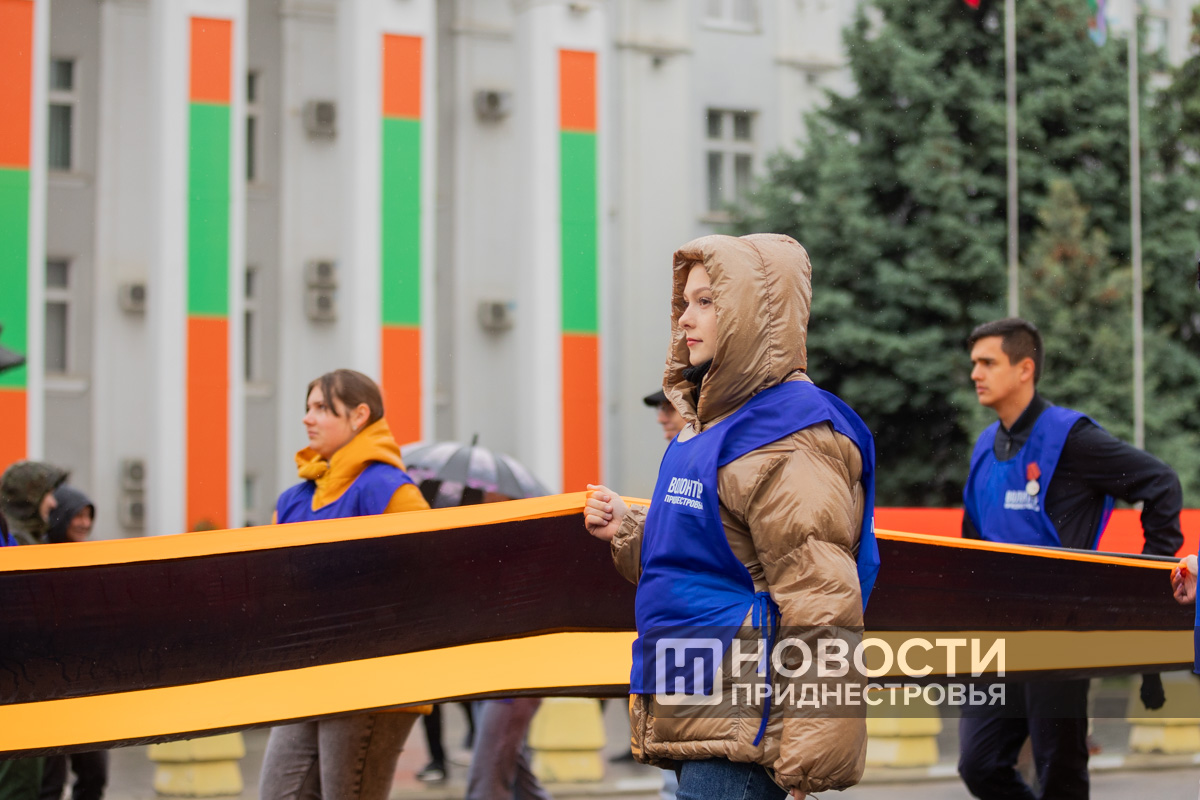 Студенты Приднестровского госуниверситета и «Волонтёры Победы» несли два огромных полотна длиной по 100 метров — одно в цветах Государственного флага ПМР, другое — в виде Георгиевской ленты.