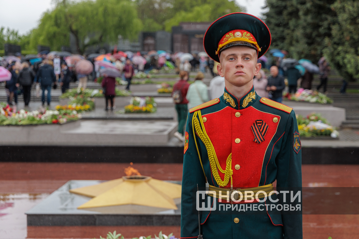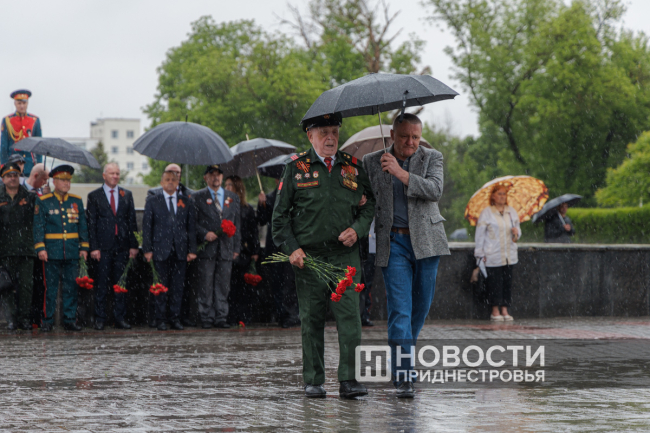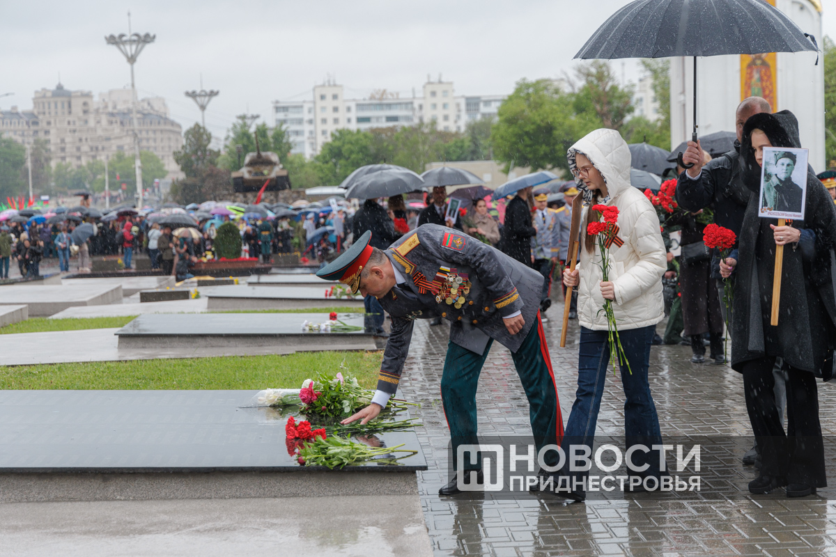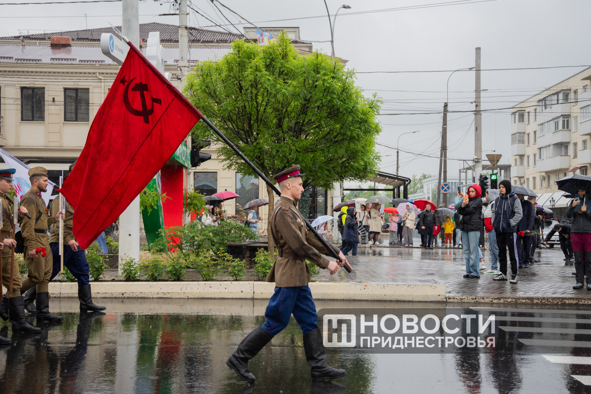 В руках у тираспольчанина Александра Артёменко необычные портреты. Они укрыты от дождя камуфляжной плащ-палаткой, а сзади реет Знамя Победы.