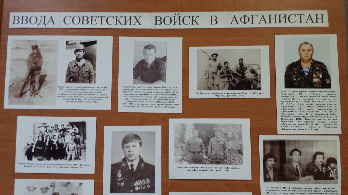 На ней представлены фотографии дубоссарцев, выполнявших свой интернациональный долг, их награды, грамоты и благодарственные письма