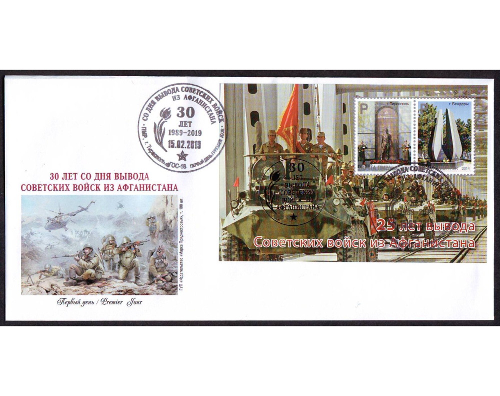 Последний раз ГУП «Издательство "Марка Приднестровья"» к афганской тематике пять лет назад. Тогда свет увидел блок, основой которого стала фотография движения бронетехники по мосту через Амударью с двумя марками с изображением памятника воинам-афганцам на тираспольском Мемориале Славы и монумента «Чёрный тюльпан» в Бендерах. В этом году его продублировали с медалеобразной надпечаткой золотом «30 лет вывода советских войск из Афганистана».