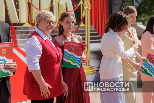 Награды выпускникам вручали: Светлана Иванишина, вице-спикер Верховного Совета ПМР Галина Антюфеева, вице-премьер Правительства Виктор Таранов, председатель столичного горсовета Вадим Дони и глава госадминистрации Тирасполя и Днестровска Илона Тюряева.