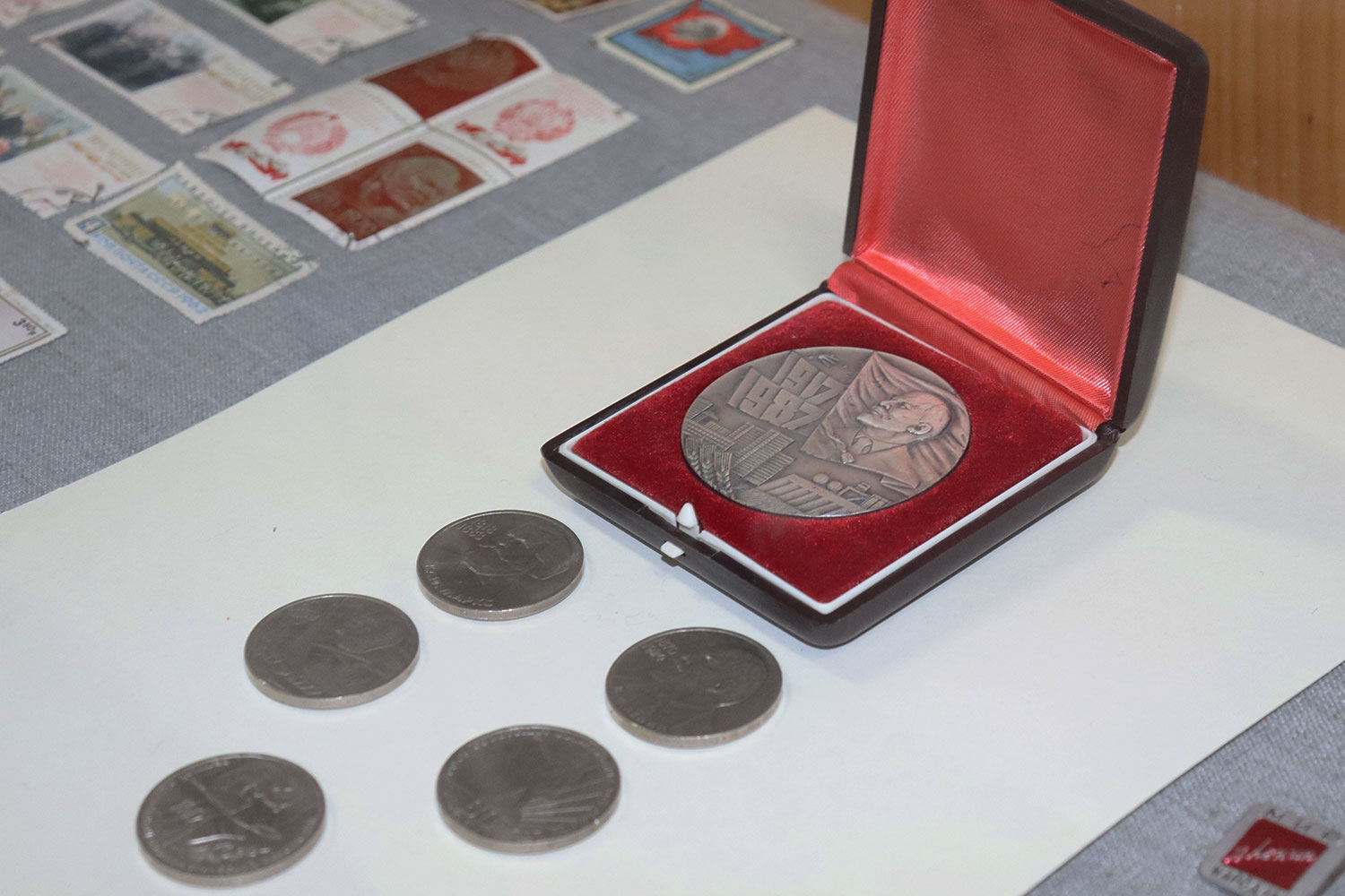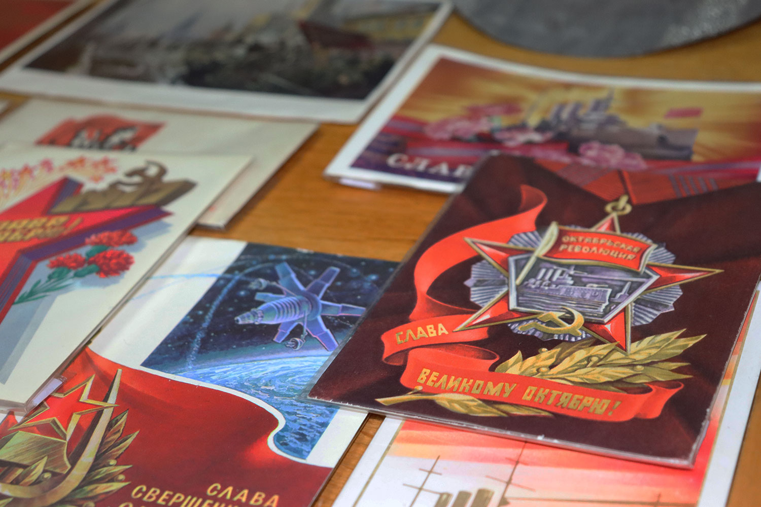 На выставке представлены марки СССР и зарубежных стран с революционной символикой, юбилейные монеты СССР, коллекция значков на тему Октябрьской революции, брошюры, книги и поздравительные открытки с праздником Великого Октября.