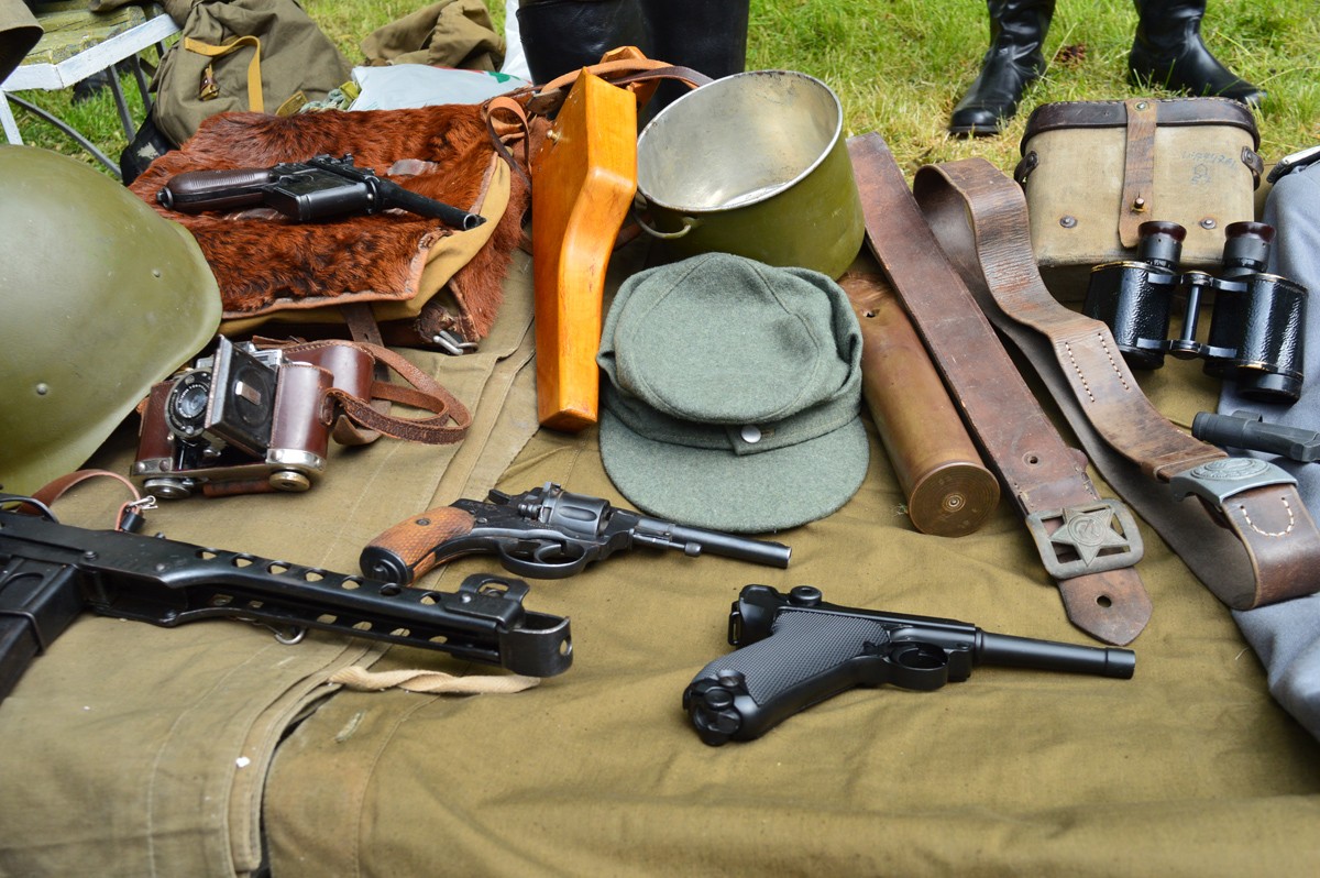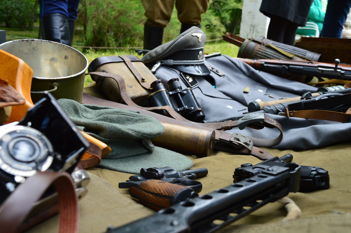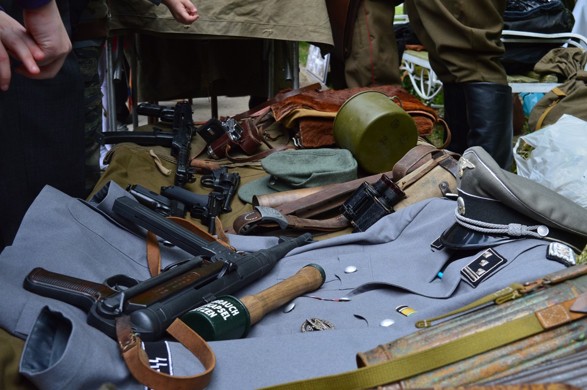 На импровизированных витринах были представлены гранаты образца 1924 года, которыми бойцы Красной Армии «встречали» немцев летом 1941 года, а затем «провожали» их до Берлина. Фляги и саперные лопатки колоритно смотрелись на фоне винтовки Мосина, пистолет-пулеметов Судаева и немецкого МP-40, а также пистолетов «Наган», «ТТ» (Тульский Токарев) и муляжей «Парабелума».
