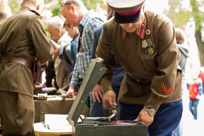 Презентация проходила под аккомпанемент песен 30-40-х годов: на трофейном немецком патефоне крутились виниловые пластинки с хитами и шлягерами тех времен. «Диск-жокеем» оказался один из организаторов выставки: одетый в форму офицера стрелковых частей РККА образца 1941 года он ловко переворачивал грампластинки, охотно отвечая на вопросы любопытствующих посетителей.