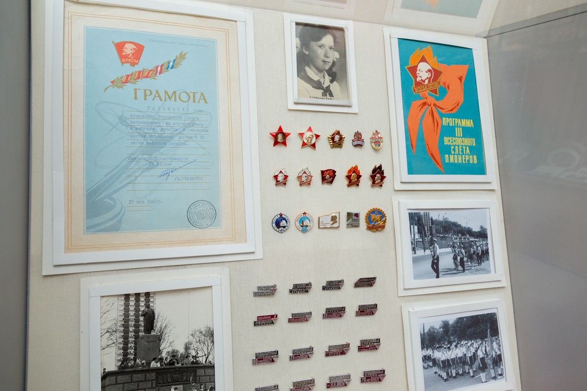 В экспозиции представлено более 300 наиболее интересных и значимых с исторической точки зрения экземпляров значков и памятных знаков – свидетелей ушедшей эпохи по тематике: Октябрьская революция, комсомол, пионерия, В.И. Ленин, советская конституция, а также другие экспонаты из фондов музея.